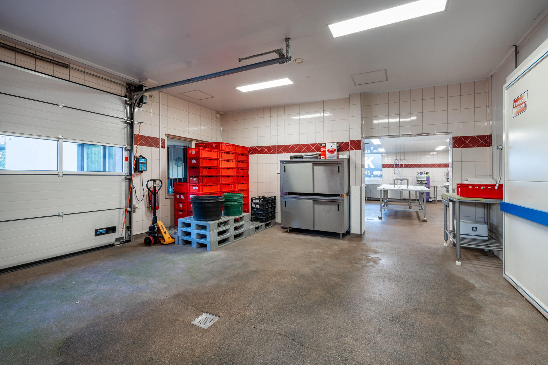 Entree, grote kantoorruimte met vast meubilair en archiefruimte, meterkast, 2e kantoorruimte, toilet, archiefkast, CV ruimte, waslokaal met douche en toilet, kantine, diverse werkruimtes met koel en vriescel, kruidenopslag en technische ruimte. Aan de voorzijde is één overheaddeur aanwezig.