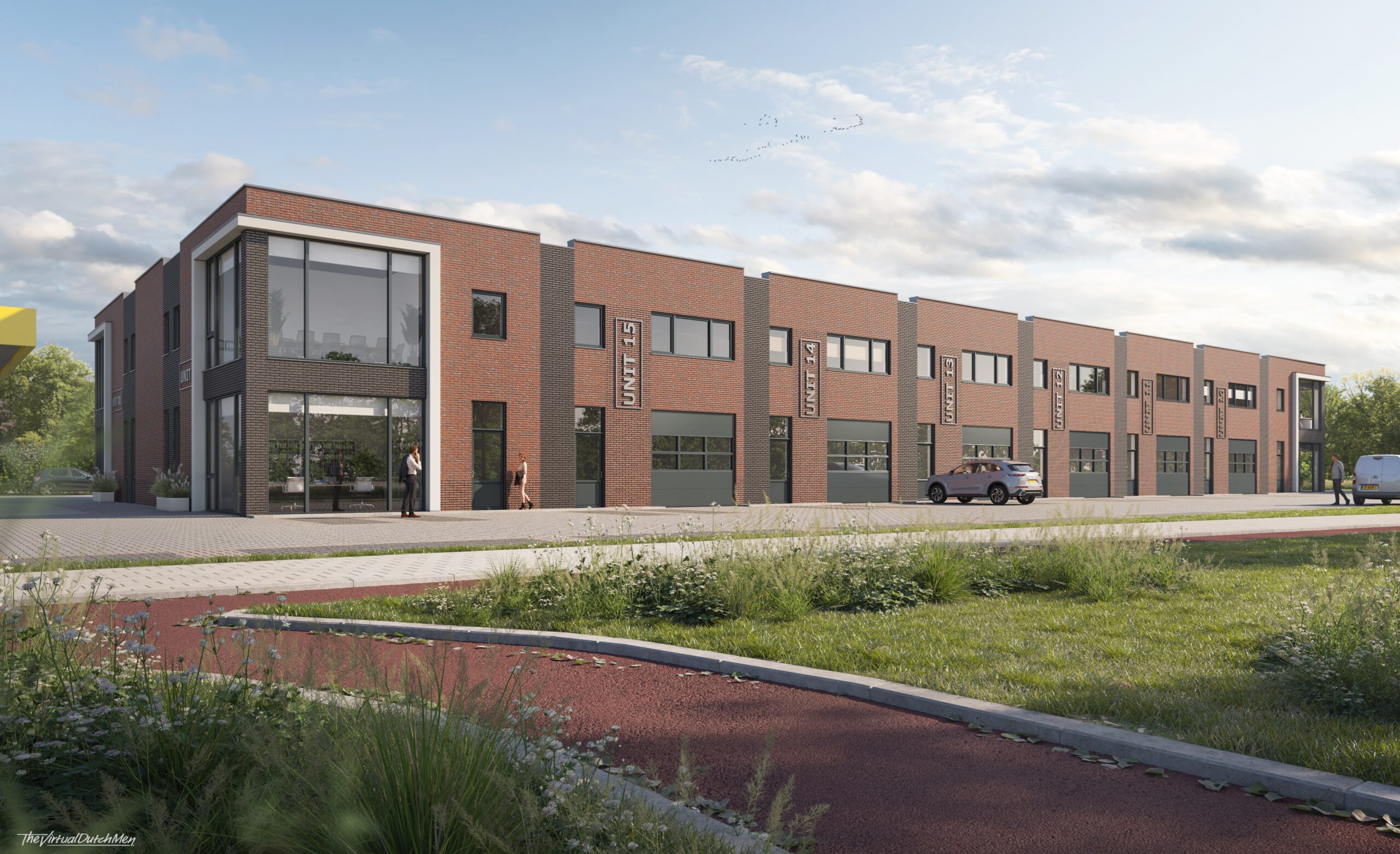 Rondom het gebouw parkeren op eigen terrein. Elke bedrijfsunit krijgt 4 of 5 eigen parkeerplaatsen toebedeeld.