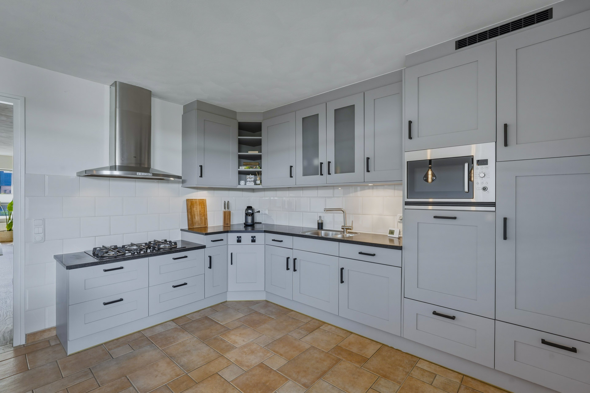 De keuken in hoekopstelling is voorzien van diverse inbouwapparatuur te weten: