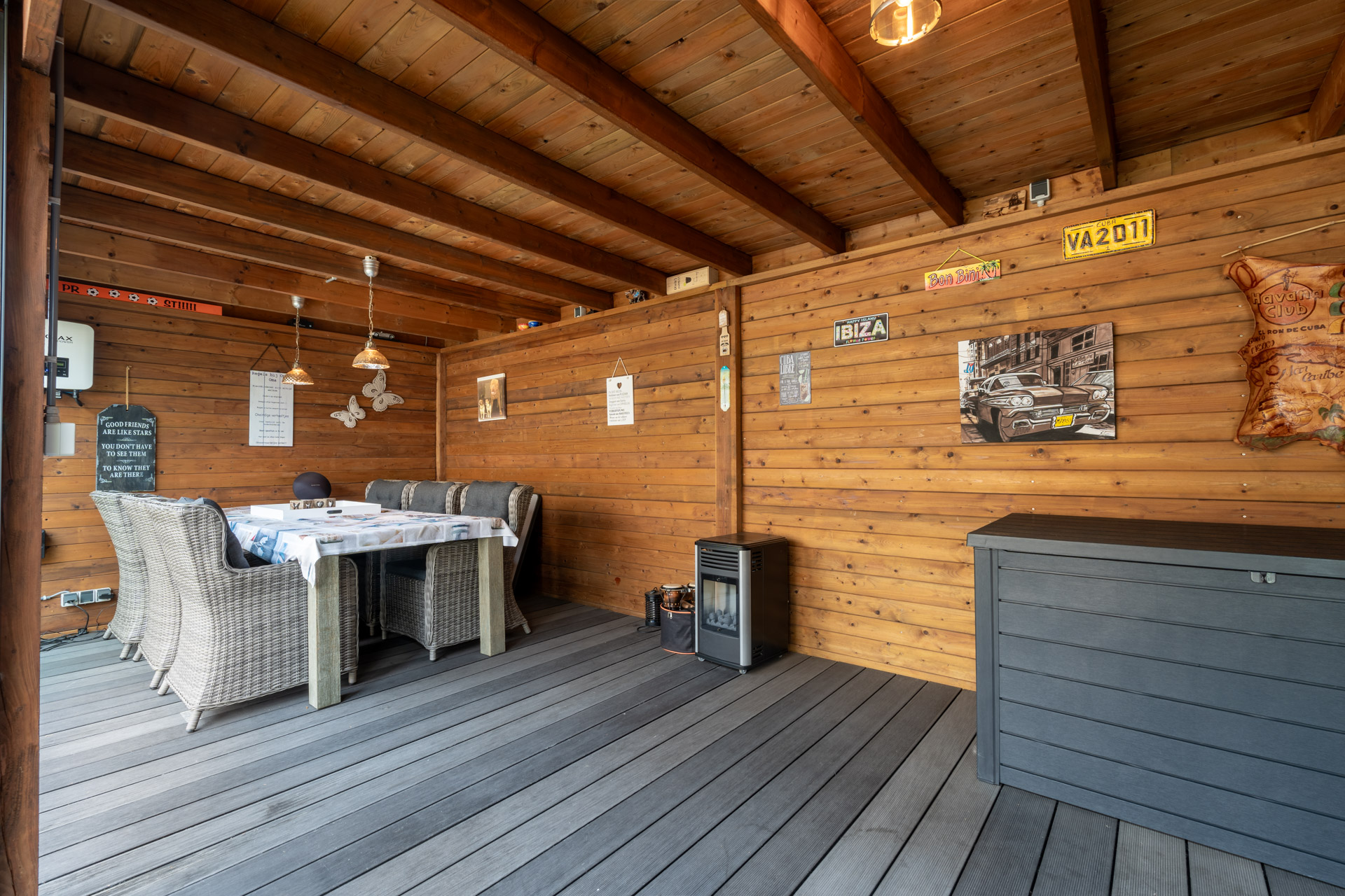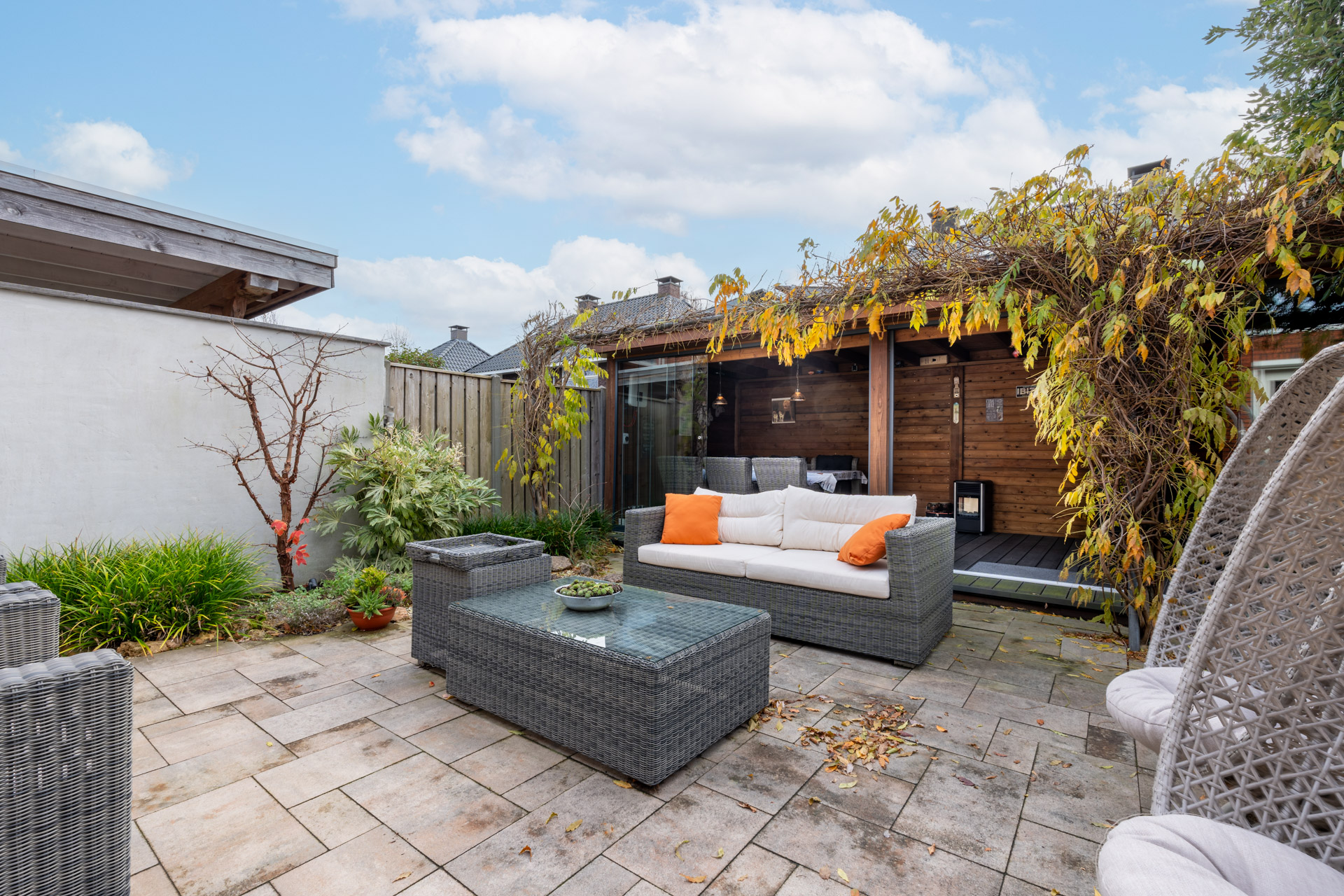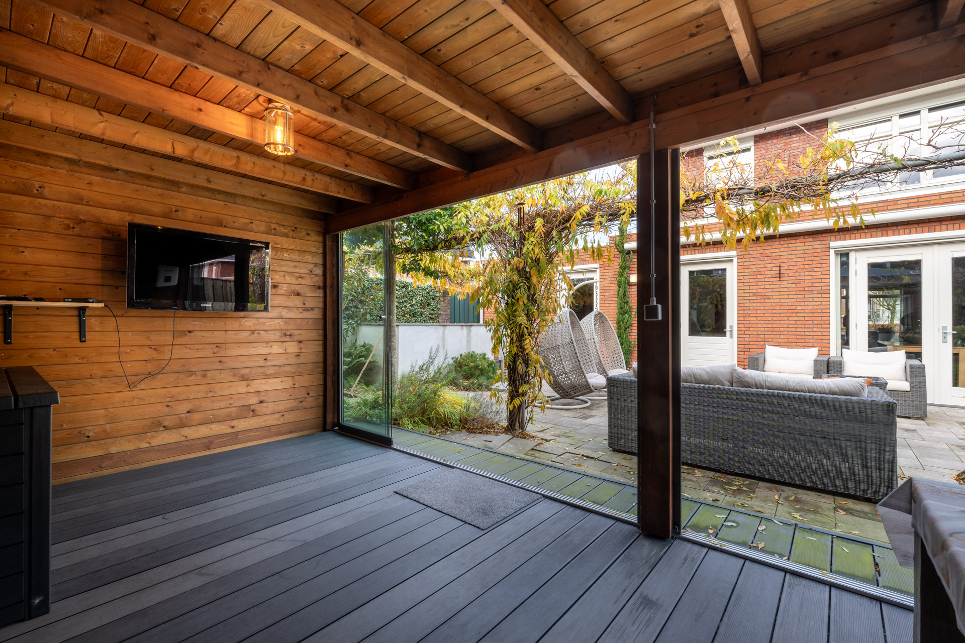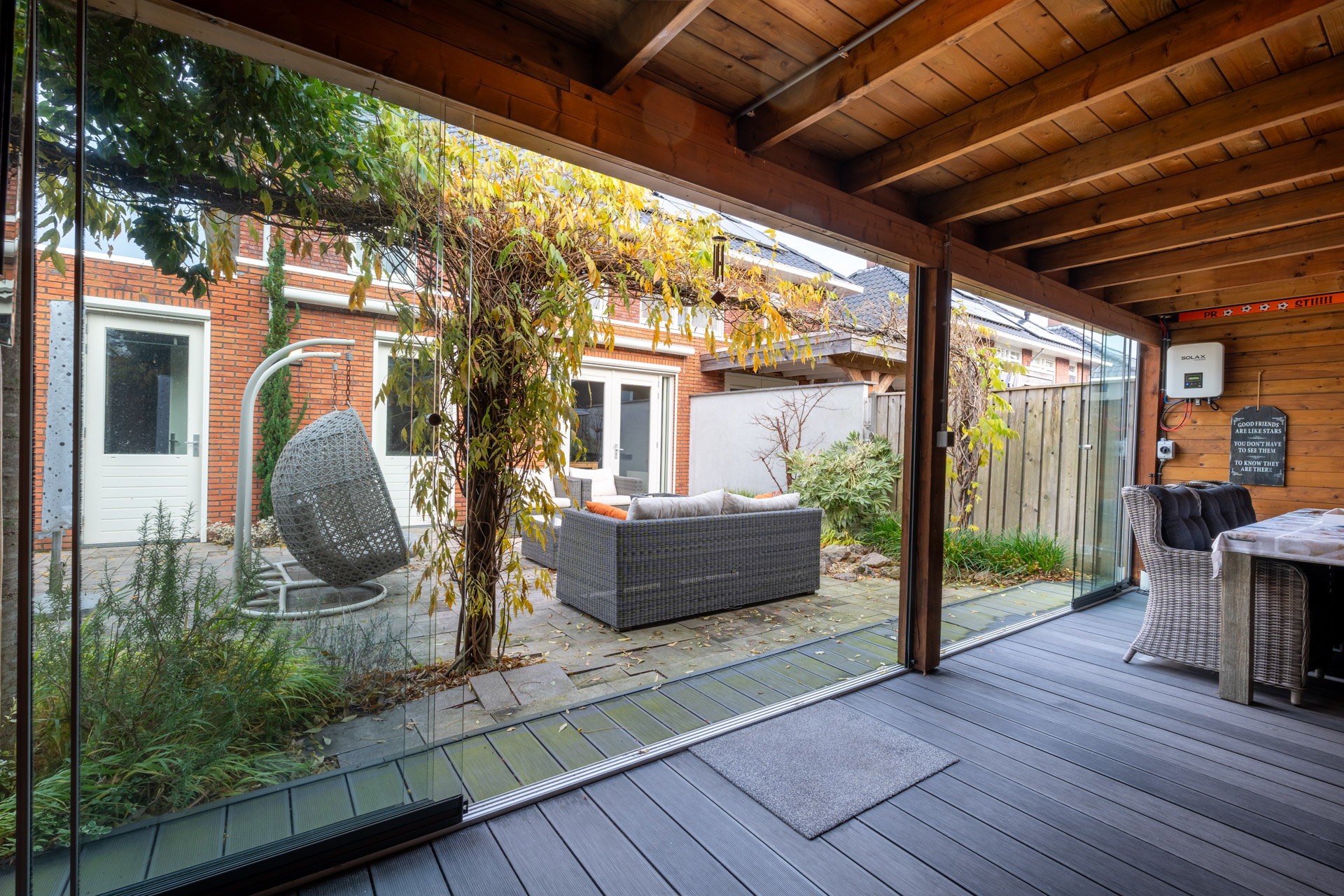 De achtertuin is perfect op het zuiden gesitueerd en voorzien van een achterom en nette overkapping met glazen schuifwanden. Grenzend aan de overkapping is een houten tuinschuur gesitueerd. Het zonneterras met zonnescherm grenst aan de leefkeuken.