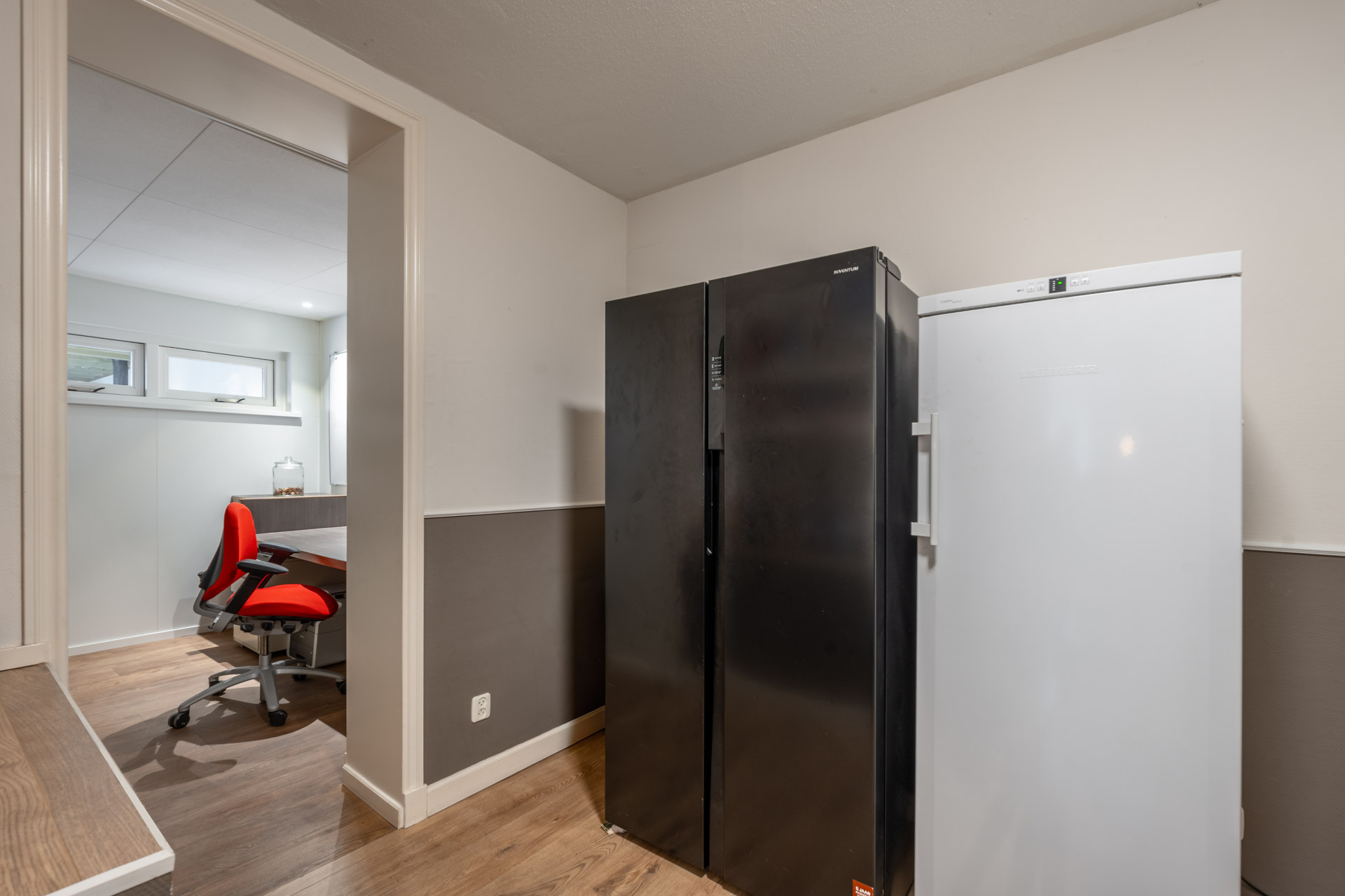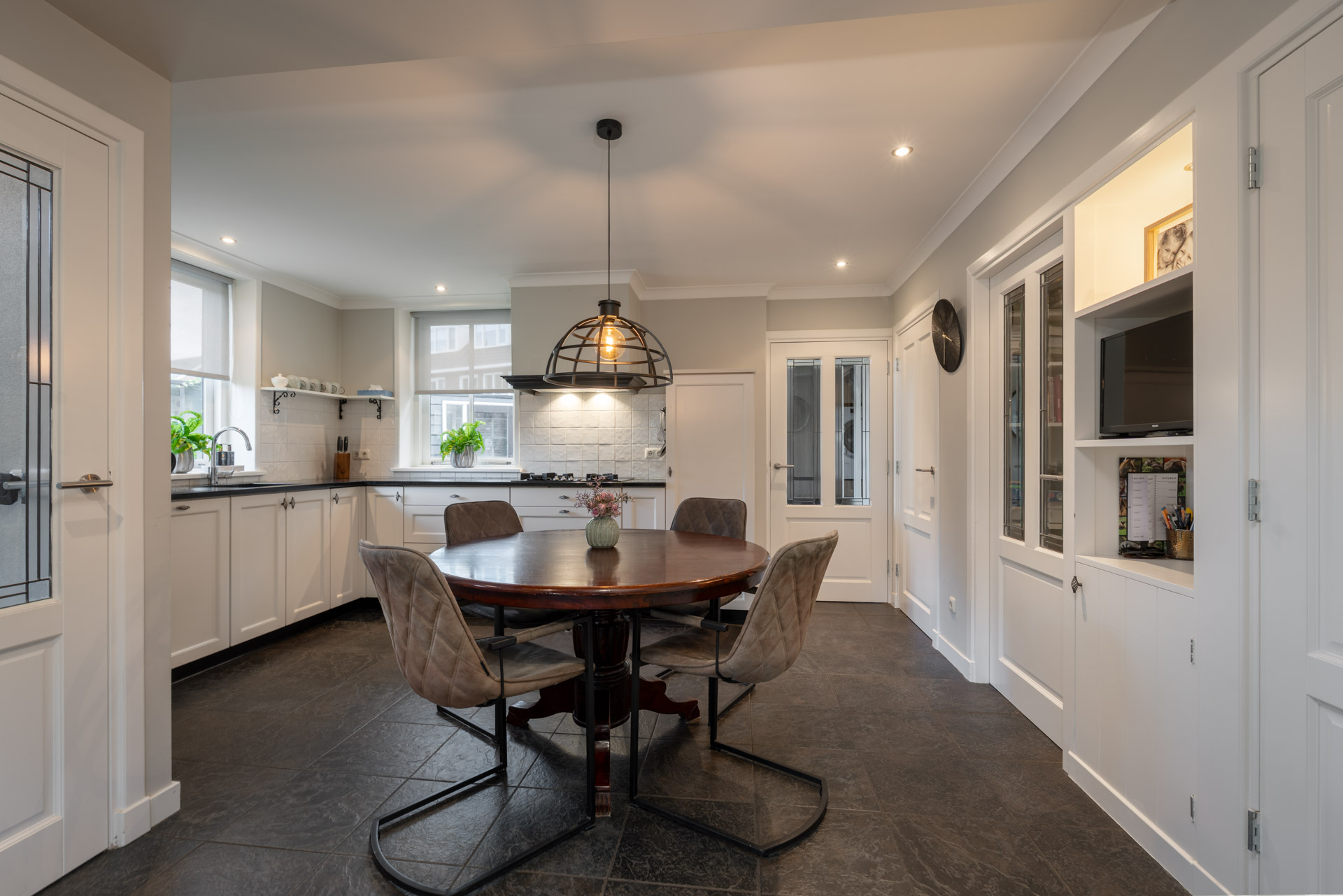 Entree met trapopgang en toegang tot de keuken en tuin. De dichte keuken is voorzien van o.a. gaskookplaat, combimagnetron, koelkast, vaatwasser, afzuigkap en close-in boiler, en beschikt daarnaast over vloerverwarming. De keuken biedt toegang tot de woonkamer met