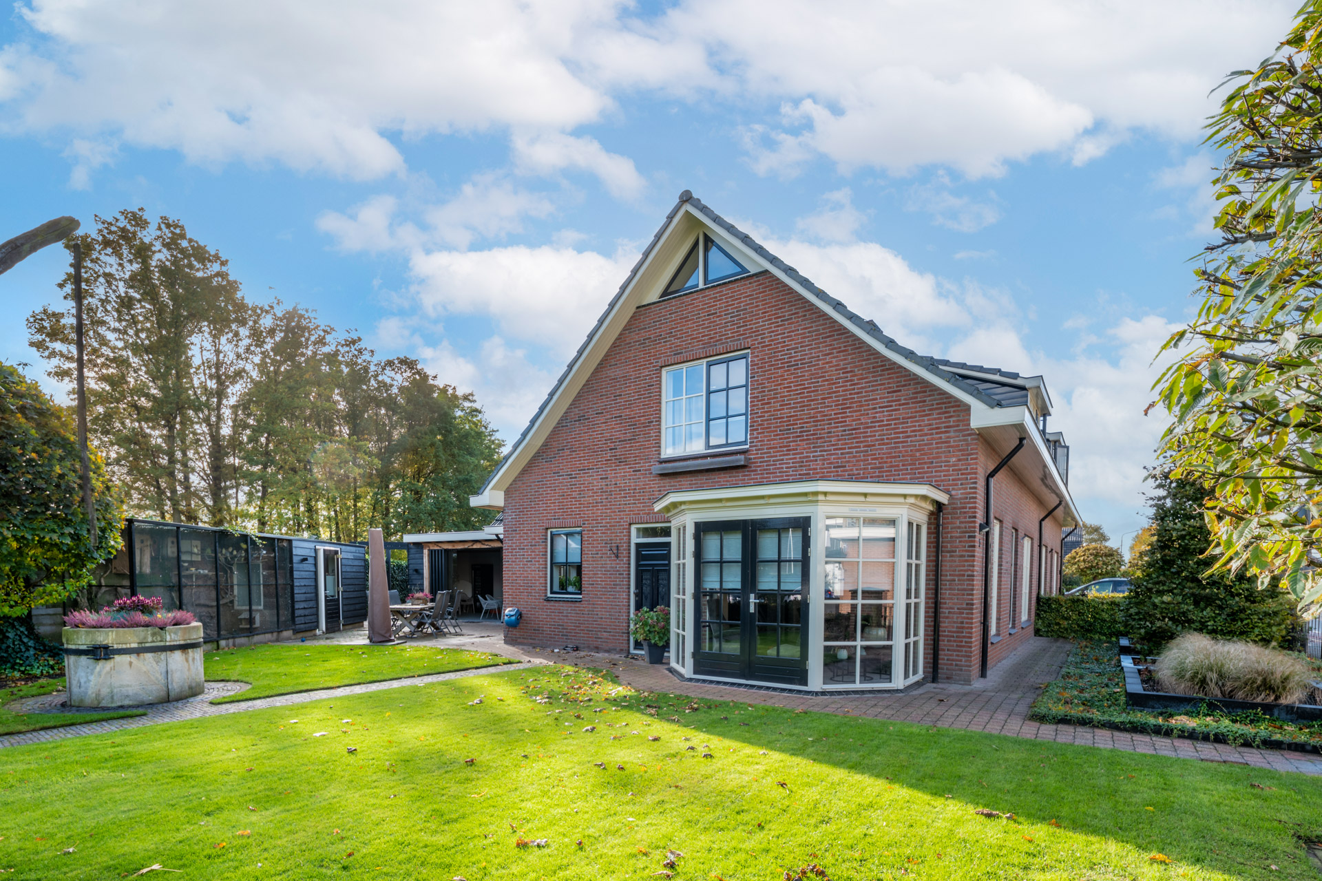 De woning beschikt over een fraai aangelegde tuin met een gazon rondom de woning. Achter in de tuin bevindt zich een tuinhuis met houtkachel en elektra – een heerlijke plek om te ontspannen of gasten te ontvangen. Daarnaast staat er een vrijstaande stenen garage met elektrische deur en zolderverdieping.