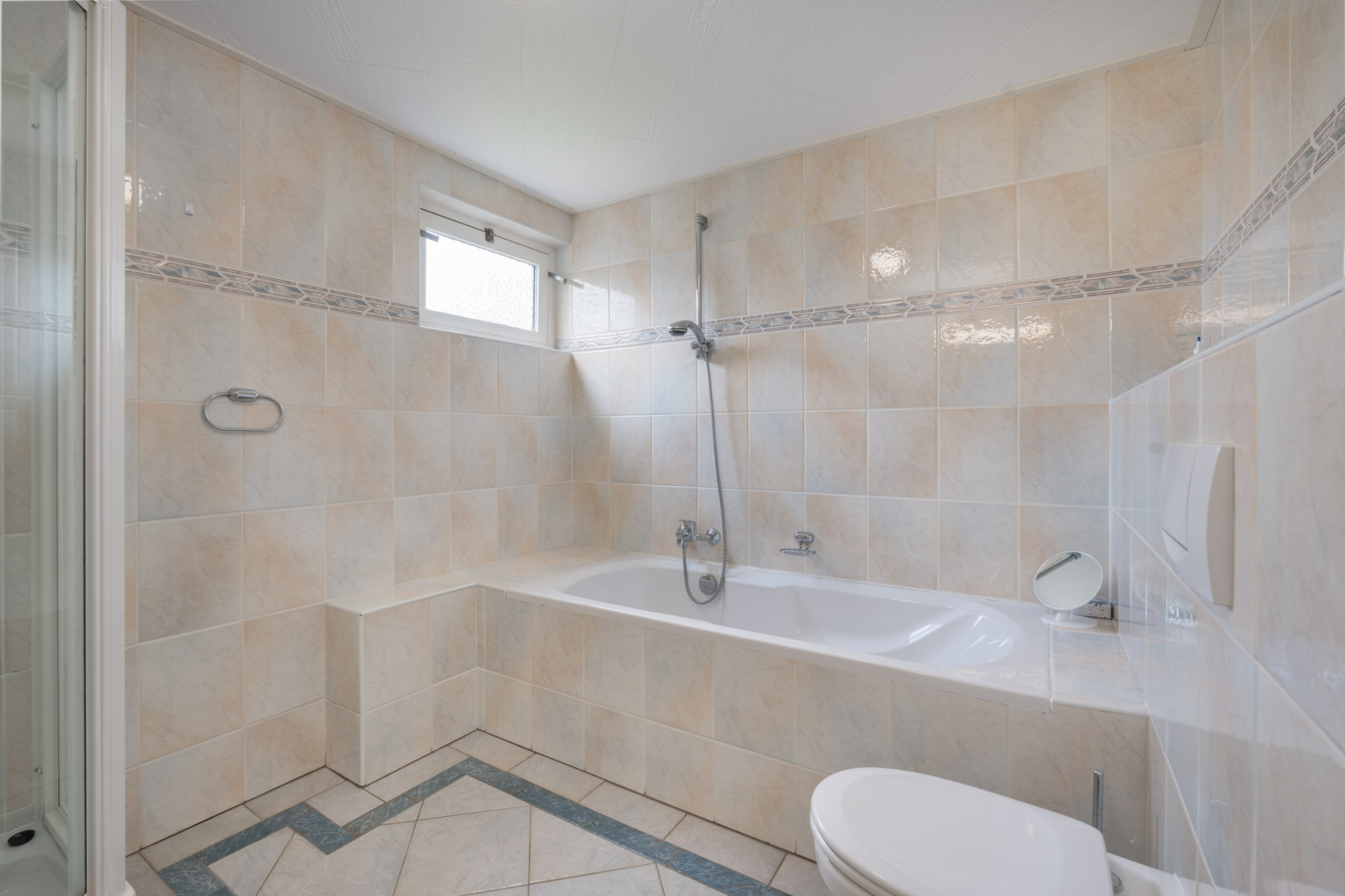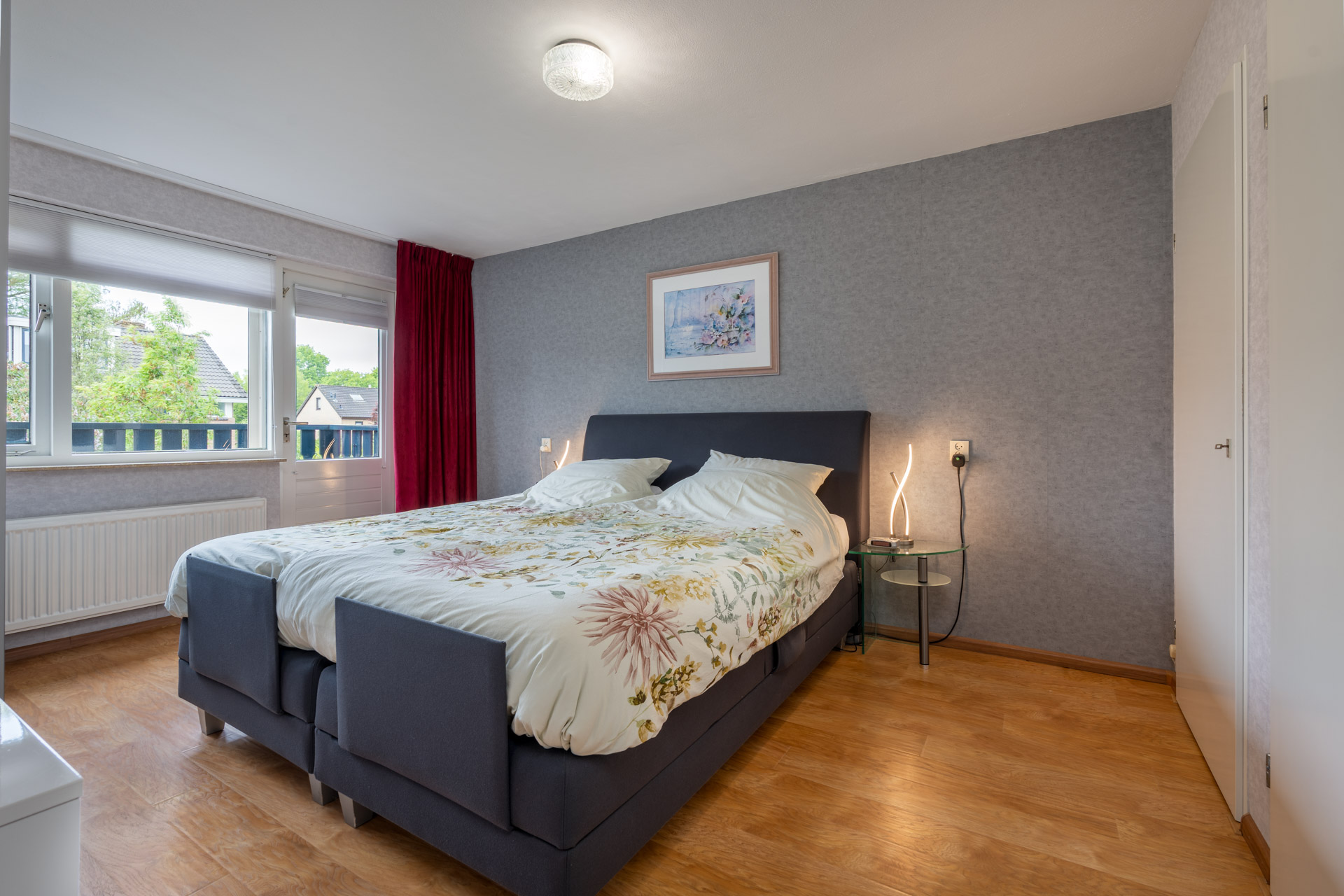 De overloop biedt toegang tot drie slaapkamers, waaronder de royale hoofdslaapkamer met toegang tot een balkon en uitzicht op de tuin. Daarnaast bevindt zich op deze verdieping een keurig onderhouden badkamer.