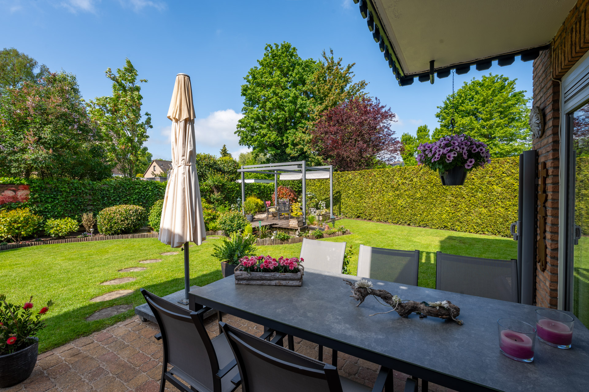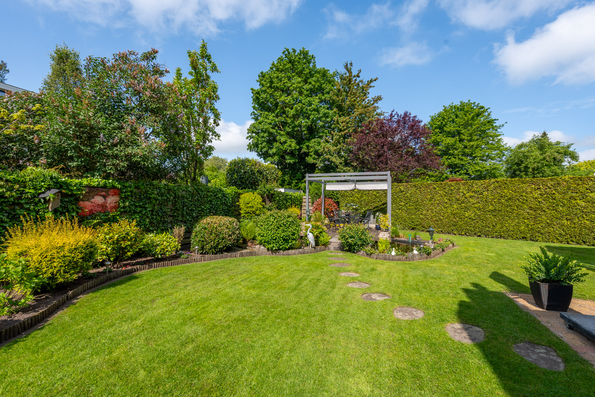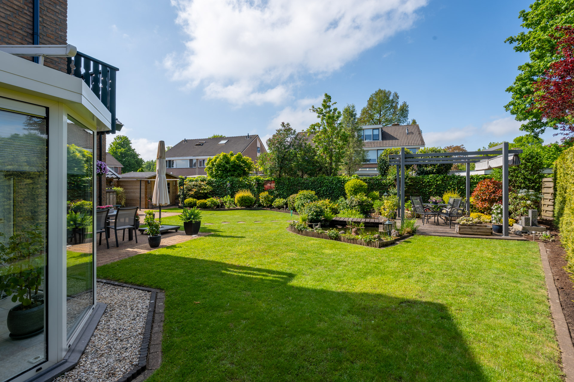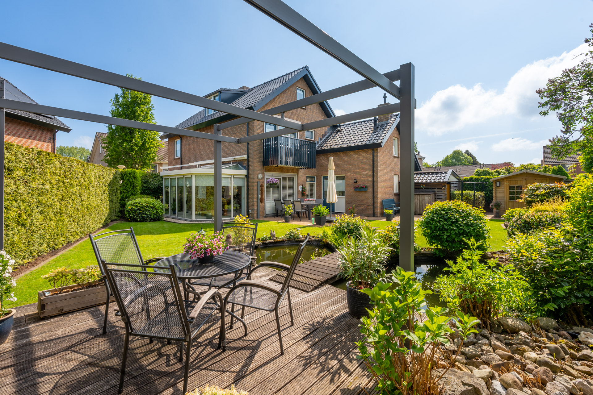 De fraai aangelegde tuin rondom de woning biedt volop ruimte en privacy. Meerdere zitgelegenheden zorgen voor heerlijke plekken om van de zon of schaduw te genieten. Onder de pergola, voorzien van een uitschuifbaar schaduwdoek, creëert u eenvoudig een beschutte loungehoek. Daarnaast beschikt de tuin over een opberghok en een sfeervolle vijverpartij.