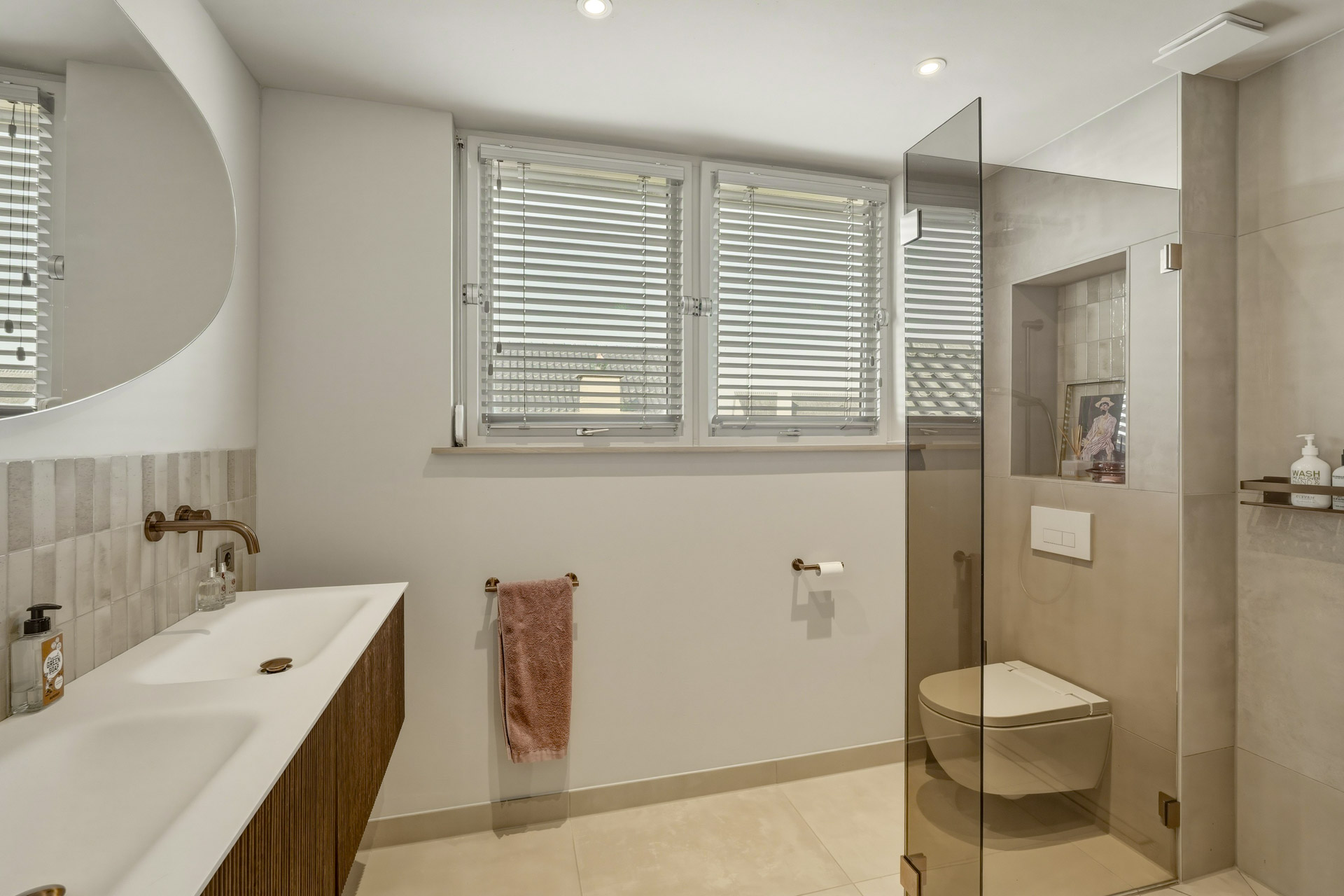 De badkamer is compleet ingericht en voorzien van onder andere een wastafelmeubel, douche en toilet.