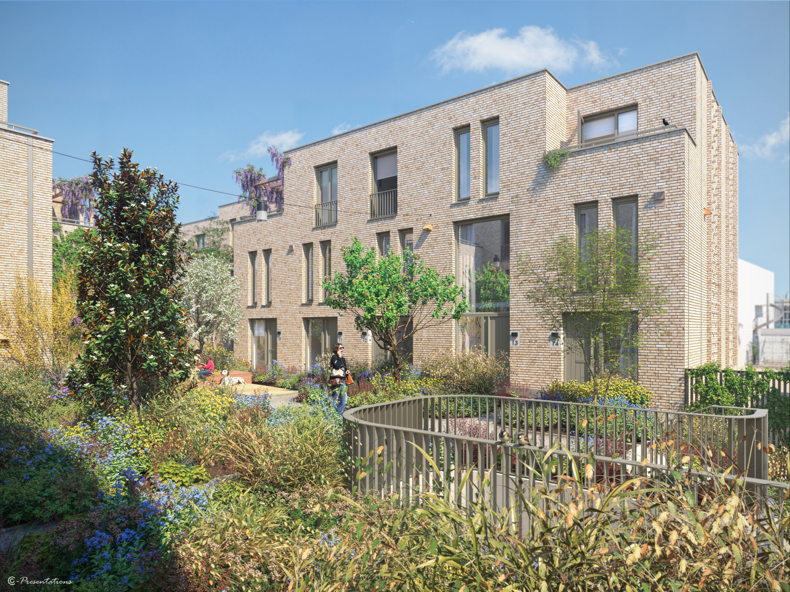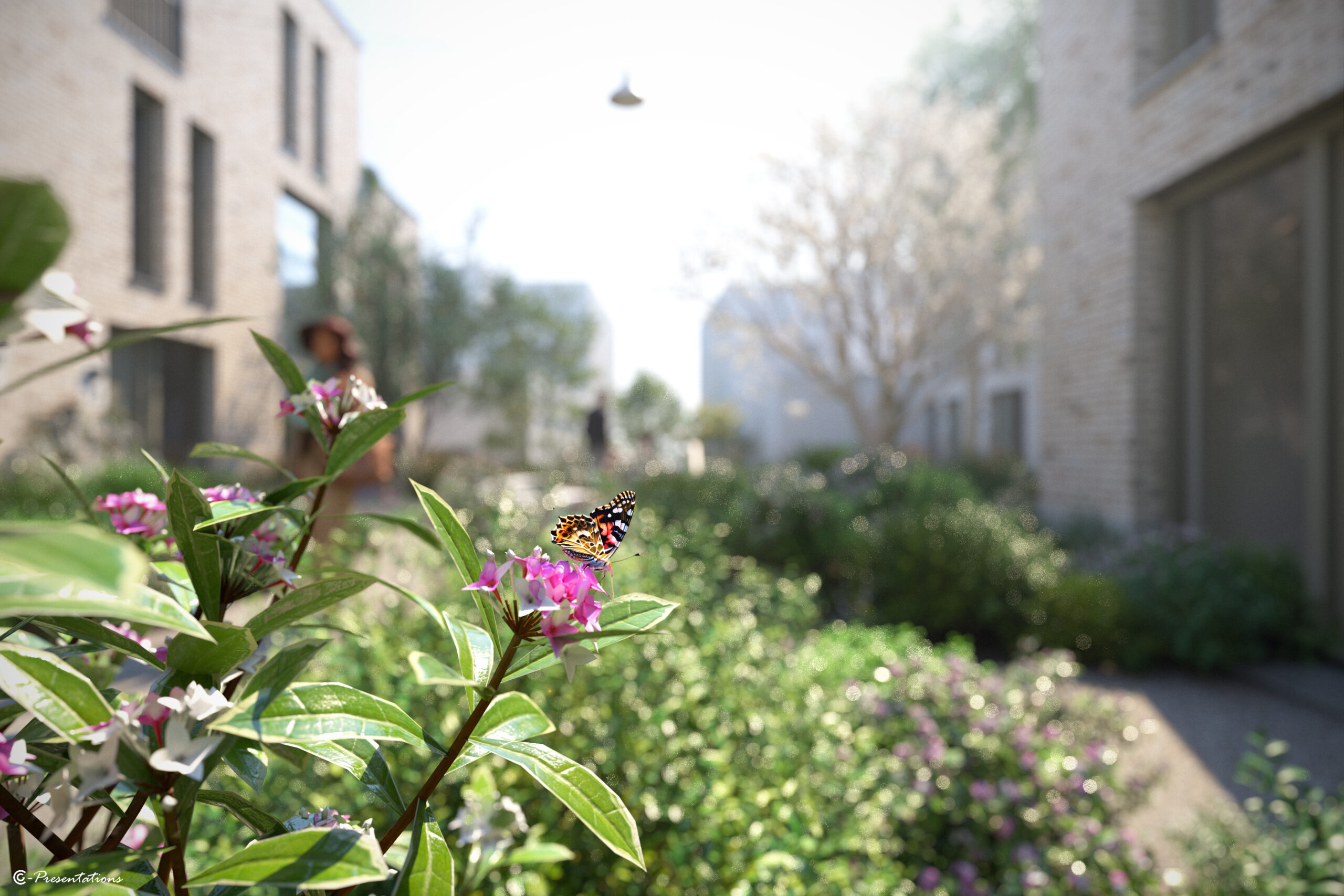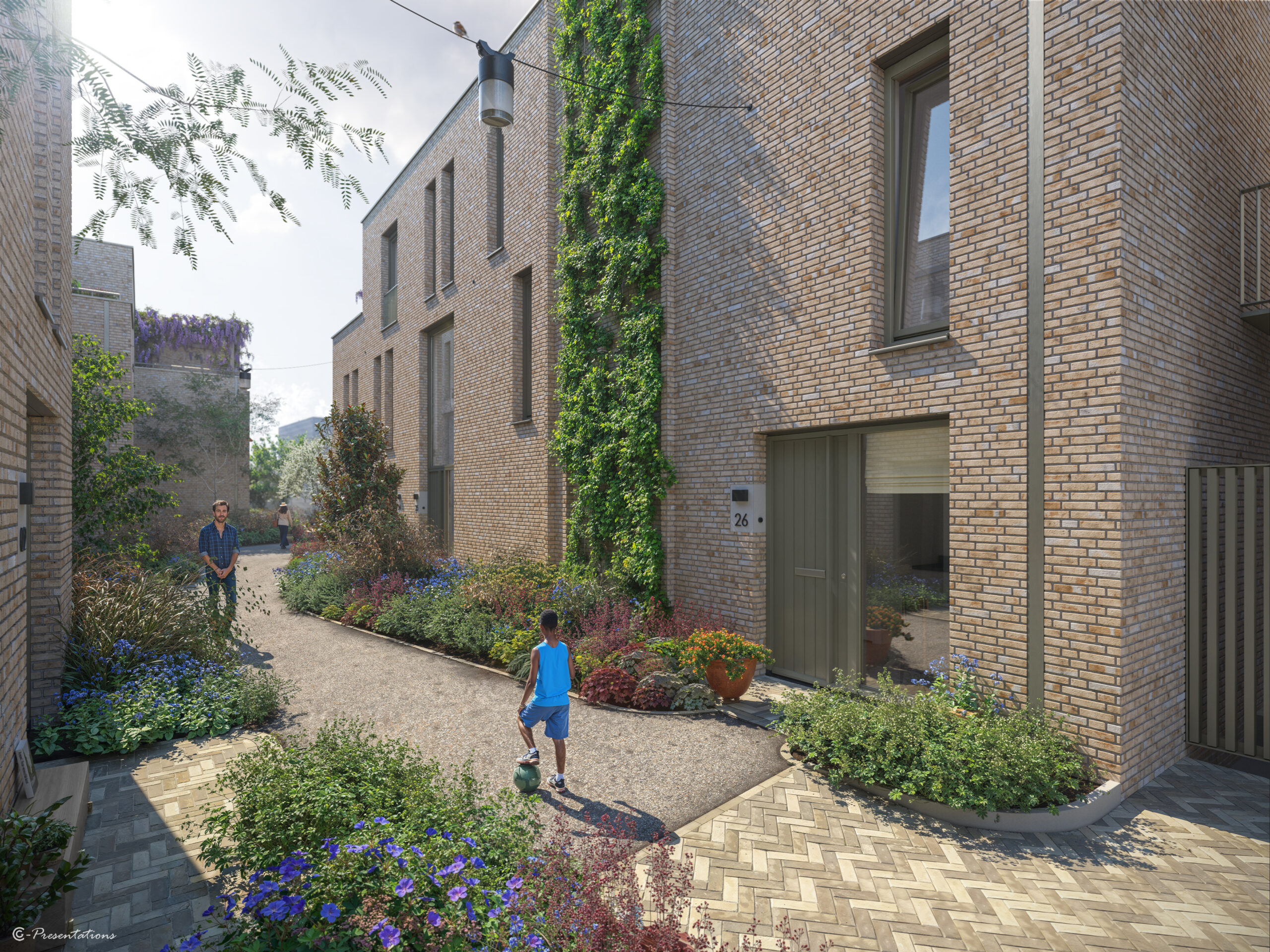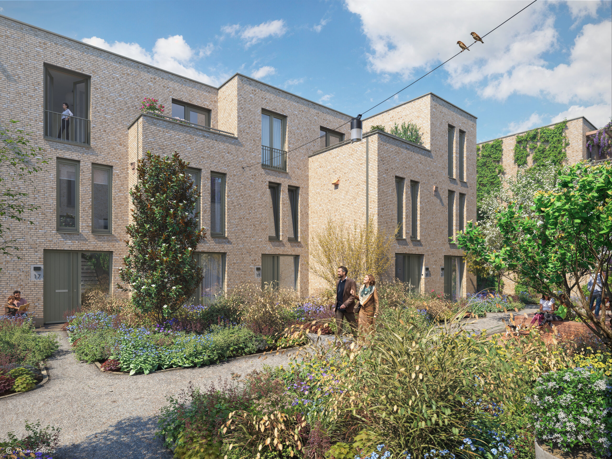 Uniek aan De Korenpassage is de prachtige groene binnentuin waar alle woningen op uitkomen. Deze gezamenlijke tuin vormt letterlijk een groene loper die alles en iedereen met elkaar verbindt. Op de route zijn leuke trappetjes aangebracht en speelse borders aangelegd. Hiervoor is een mix van verschillende materialen gebruikt. Wat betreft de bestrating sluit de binnentuin perfect aan op de bestaande straten.