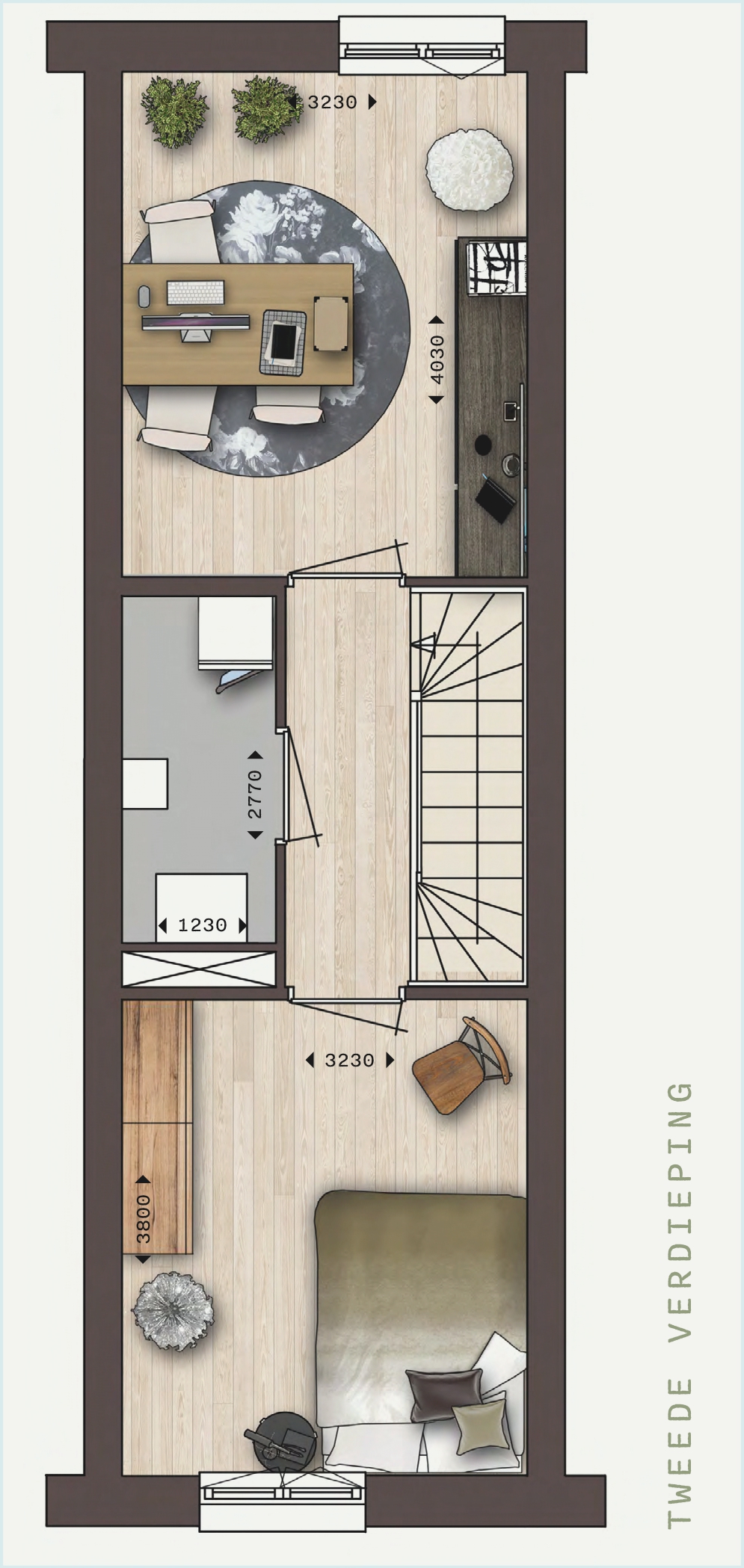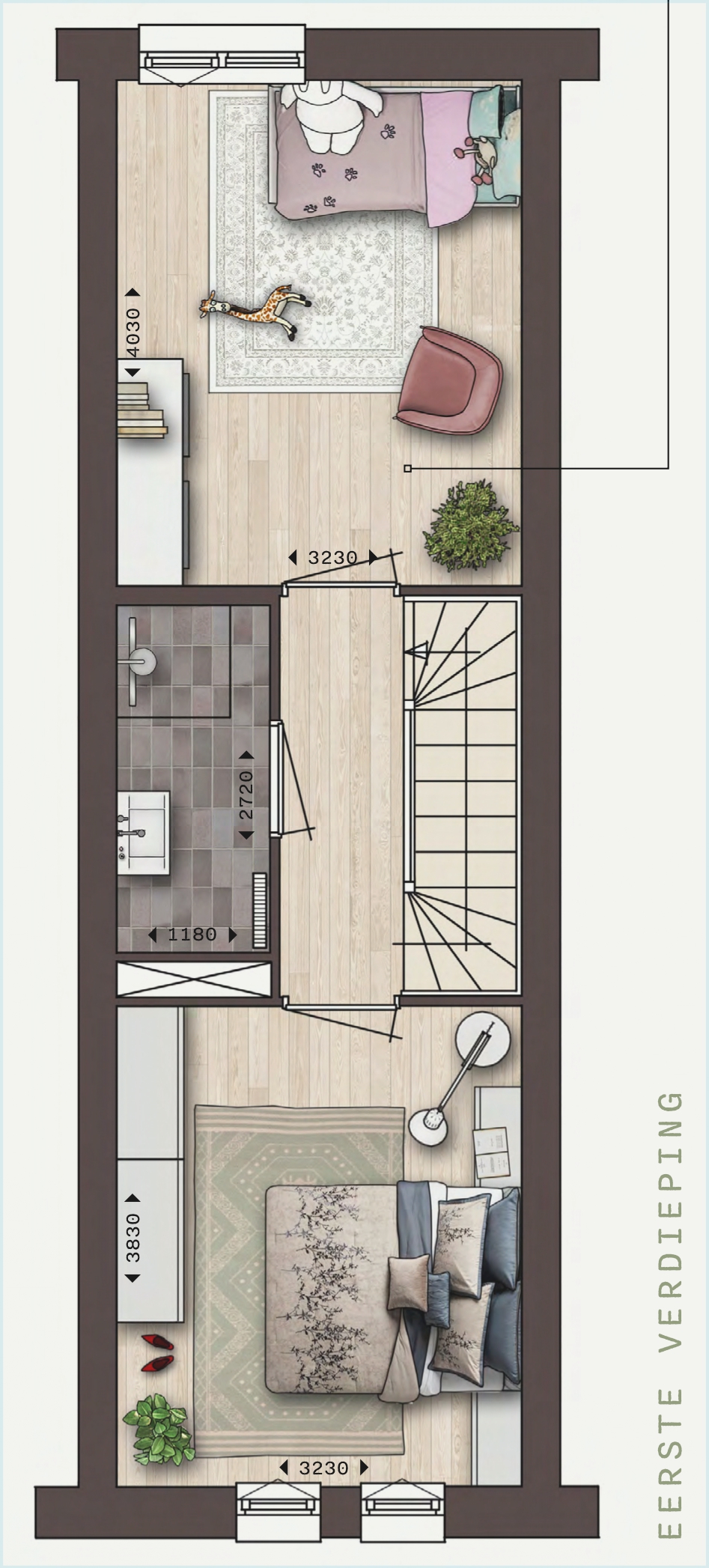 Op de eerste verdieping bevinden zich twee slaapkamers en de casco badkamer, met aansluiting voor een toilet. De tweede verdieping biedt nog twee slaapkamers en de technische ruimte met extra bergruimte.