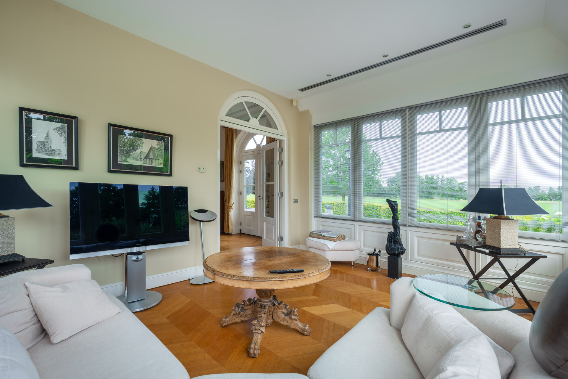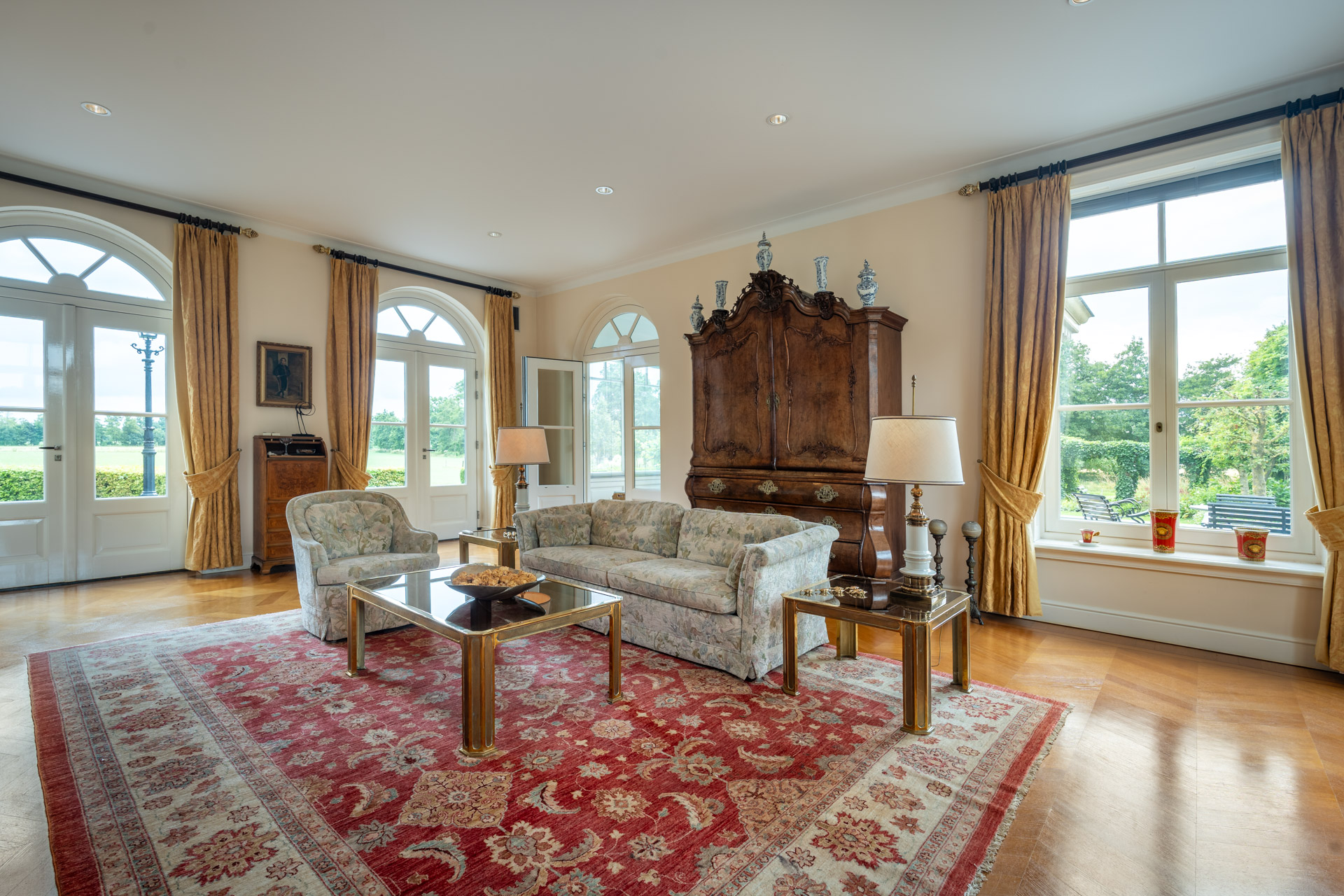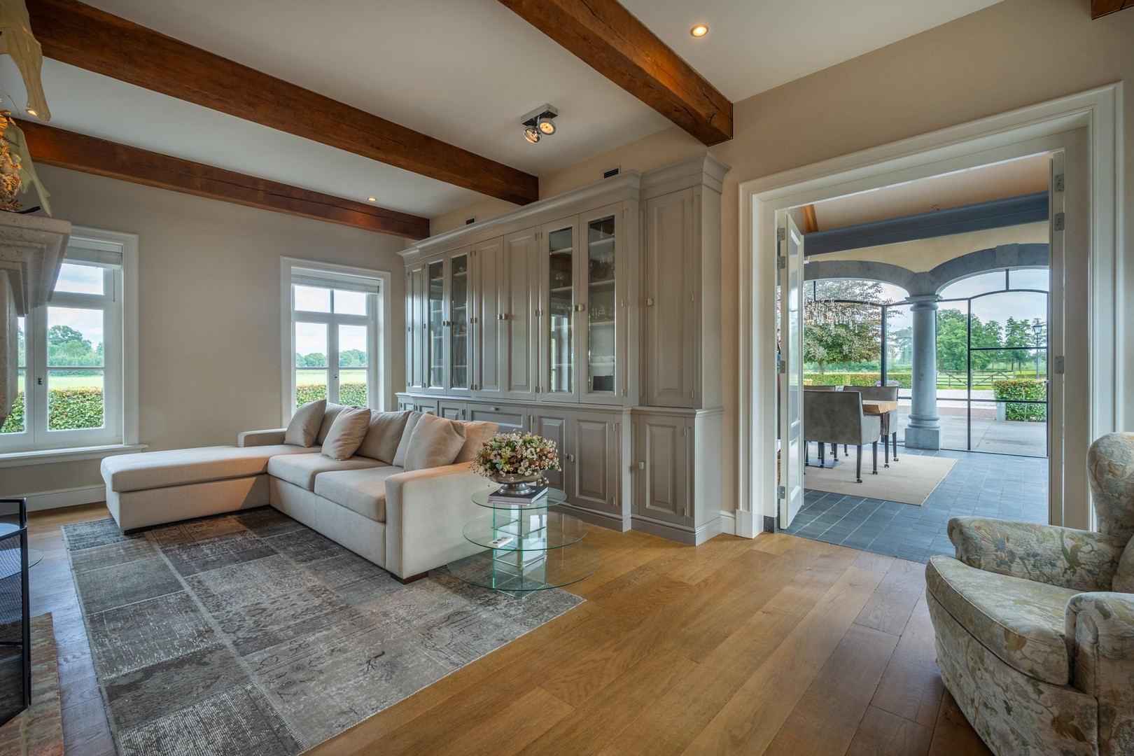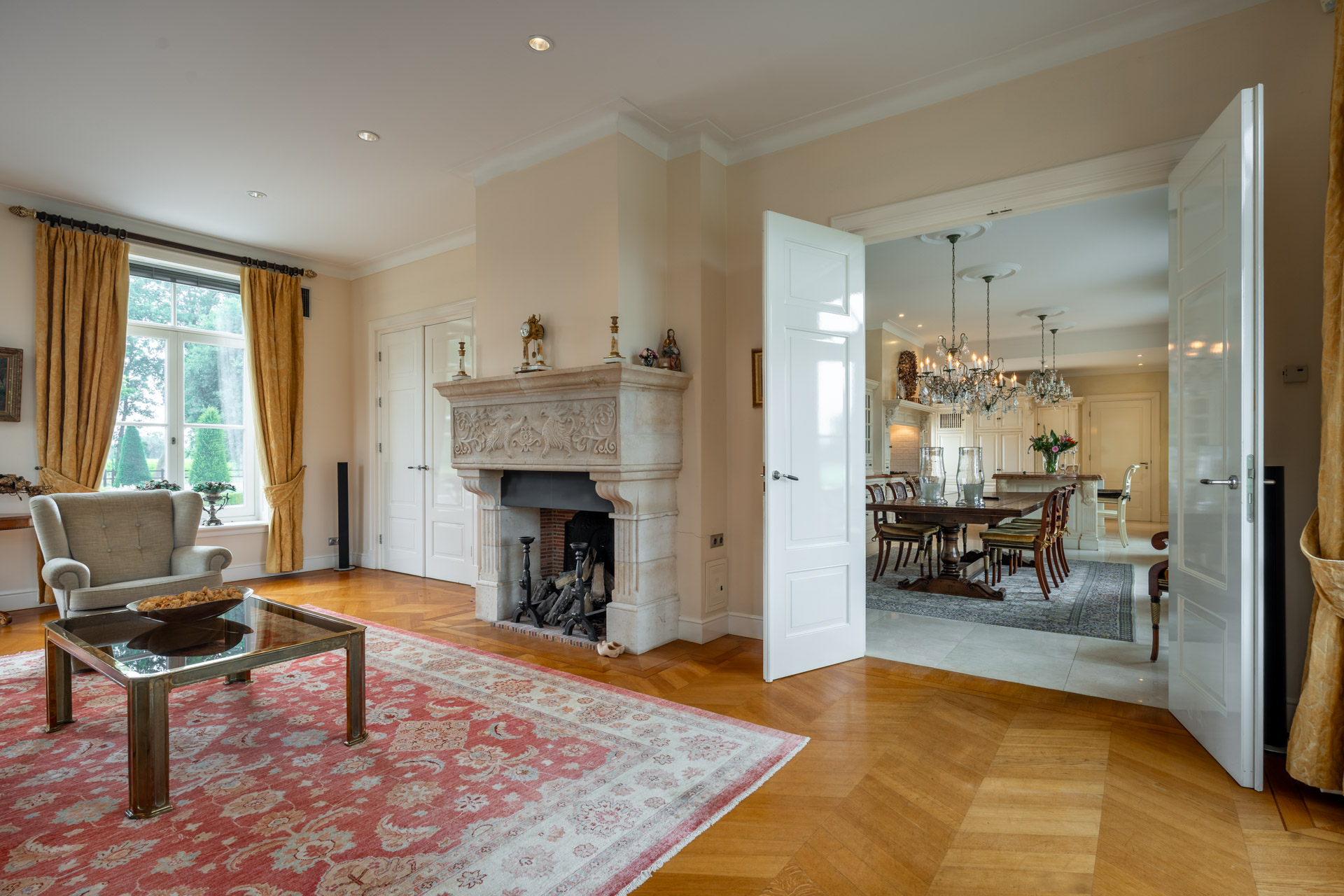 De woonkamer is royaal van opzet en ademt warmte en verfijning, onder meer door de aanwezigheid van een open haard met natuurstenen schouw. Grote raampartijen zorgen voor een prachtig zicht op het omliggende landschap, terwijl openslaande deuren de verbinding vormen met de fraaie serre.