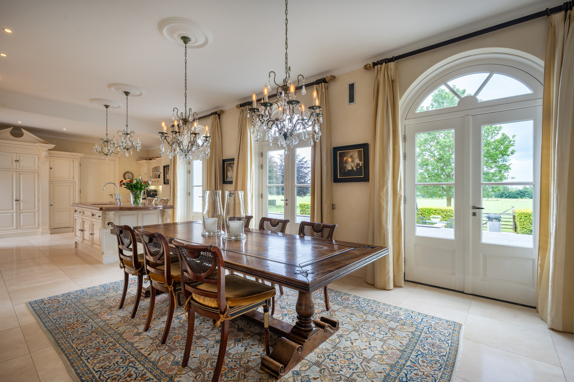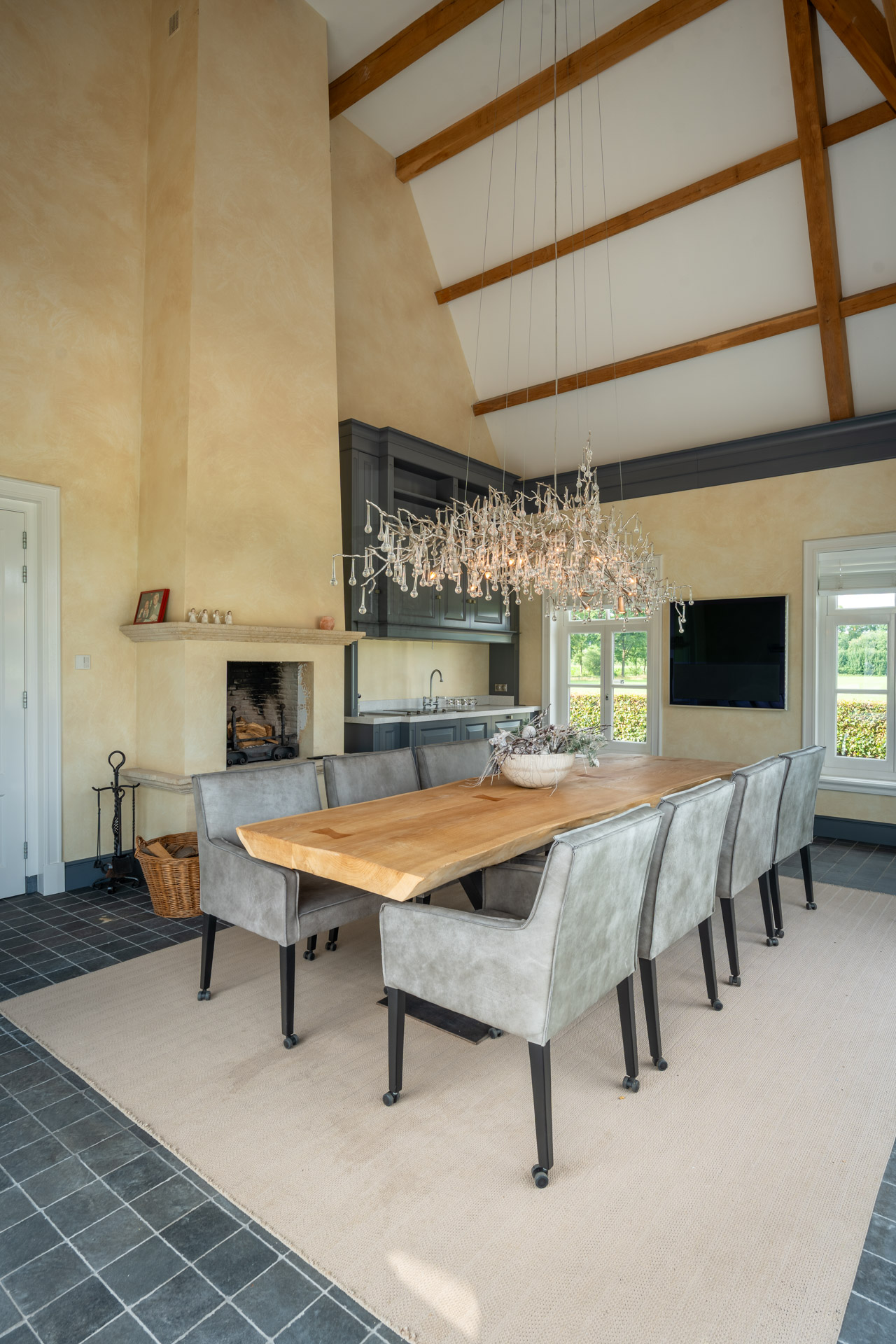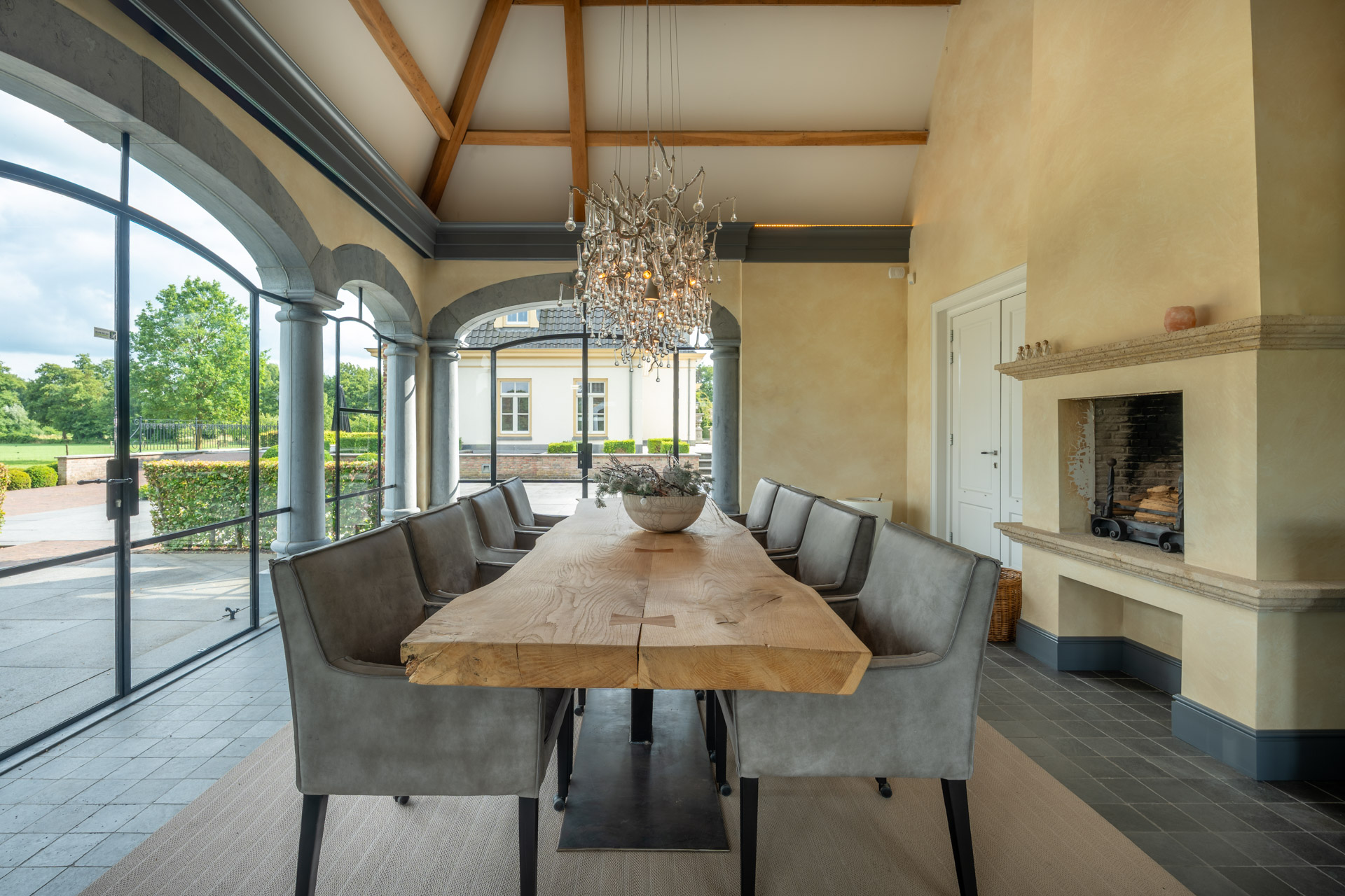 Aangrenzend bevindt zich een overdekte veranda met geïntegreerde keuken – een beschutte plek voor het vieren van lange avonden met gasten of het genieten in volle rust.