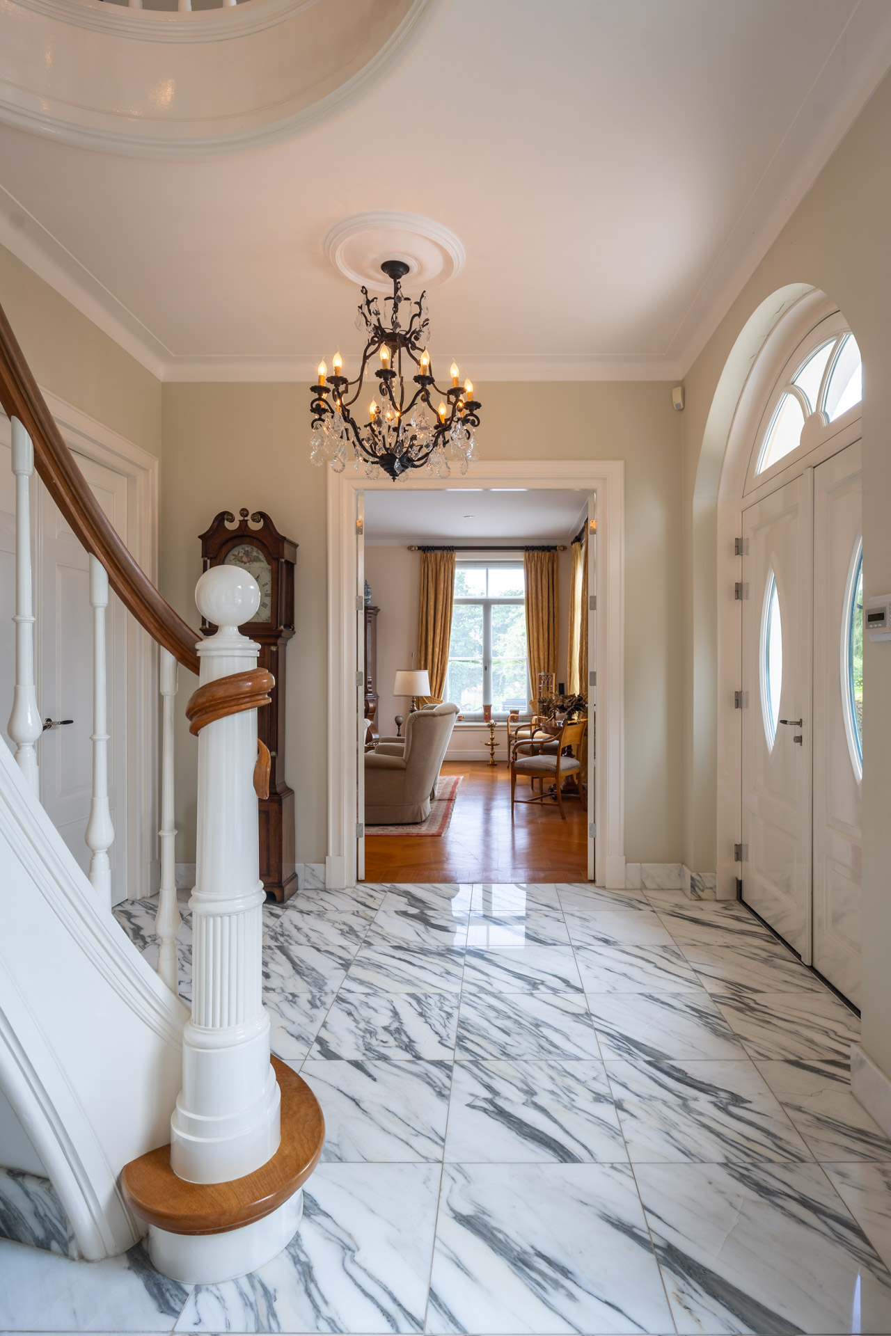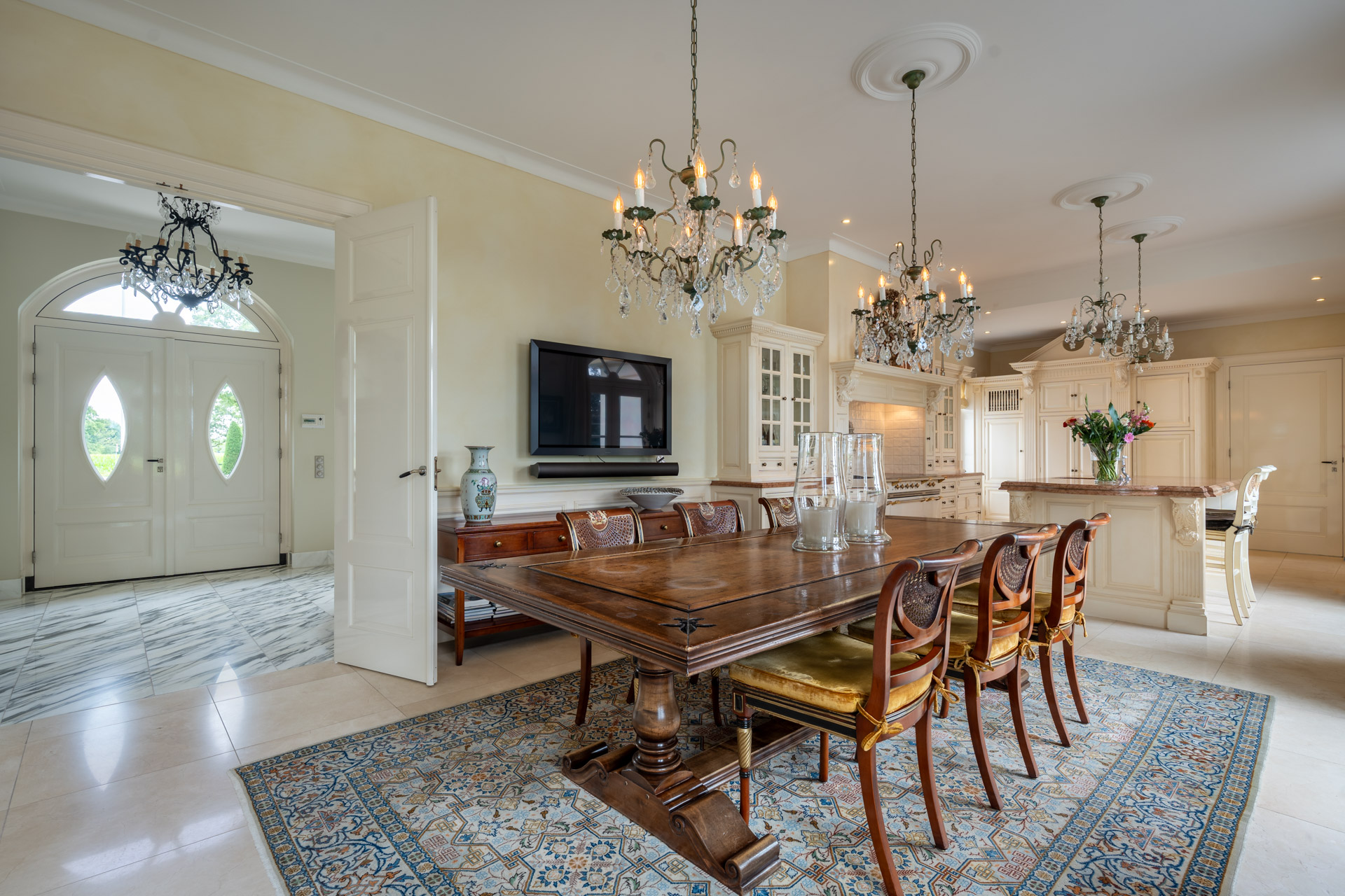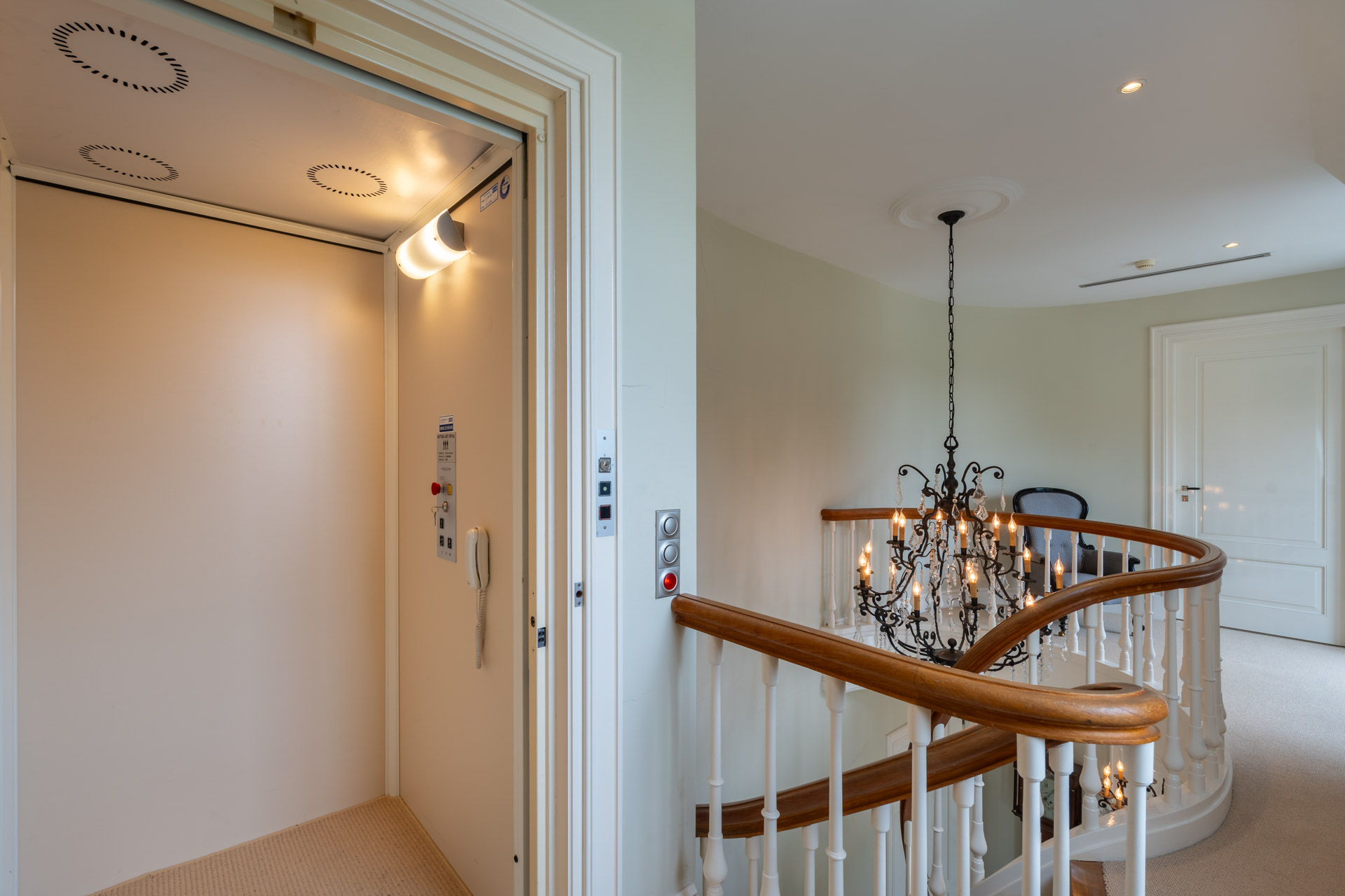 Bij aankomst betreedt men de woning via een statige entreehal met klassieke allure. De hal ademt rust en grootsheid, en biedt toegang tot het gastentoilet, een elegante trapopgang én een geïntegreerde lift – een zeldzaam comfortelement dat alle verdiepingen ontsluit. Vanuit de hal openen zich een indrukwekkende leefruimte en een imposante open keuken.
