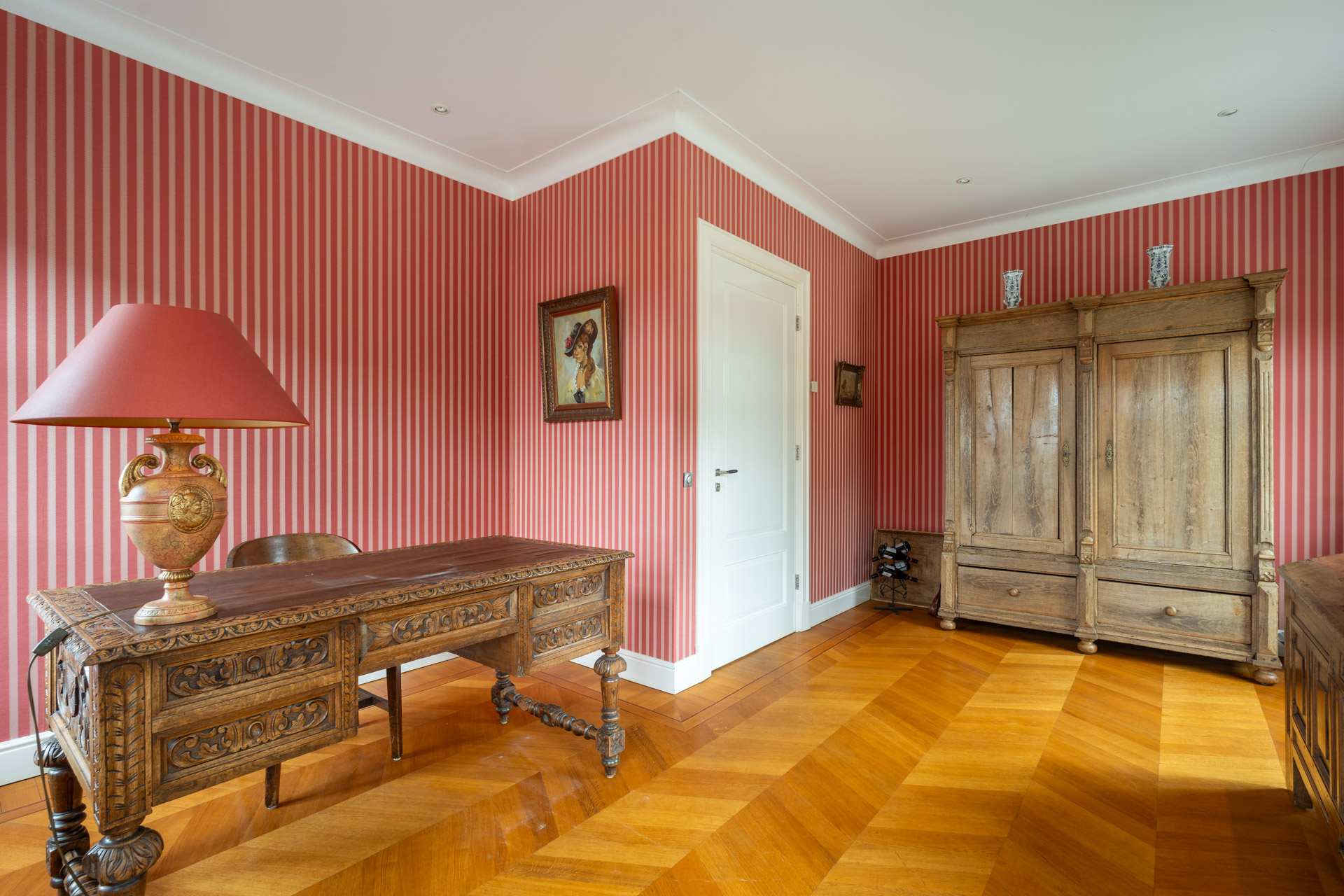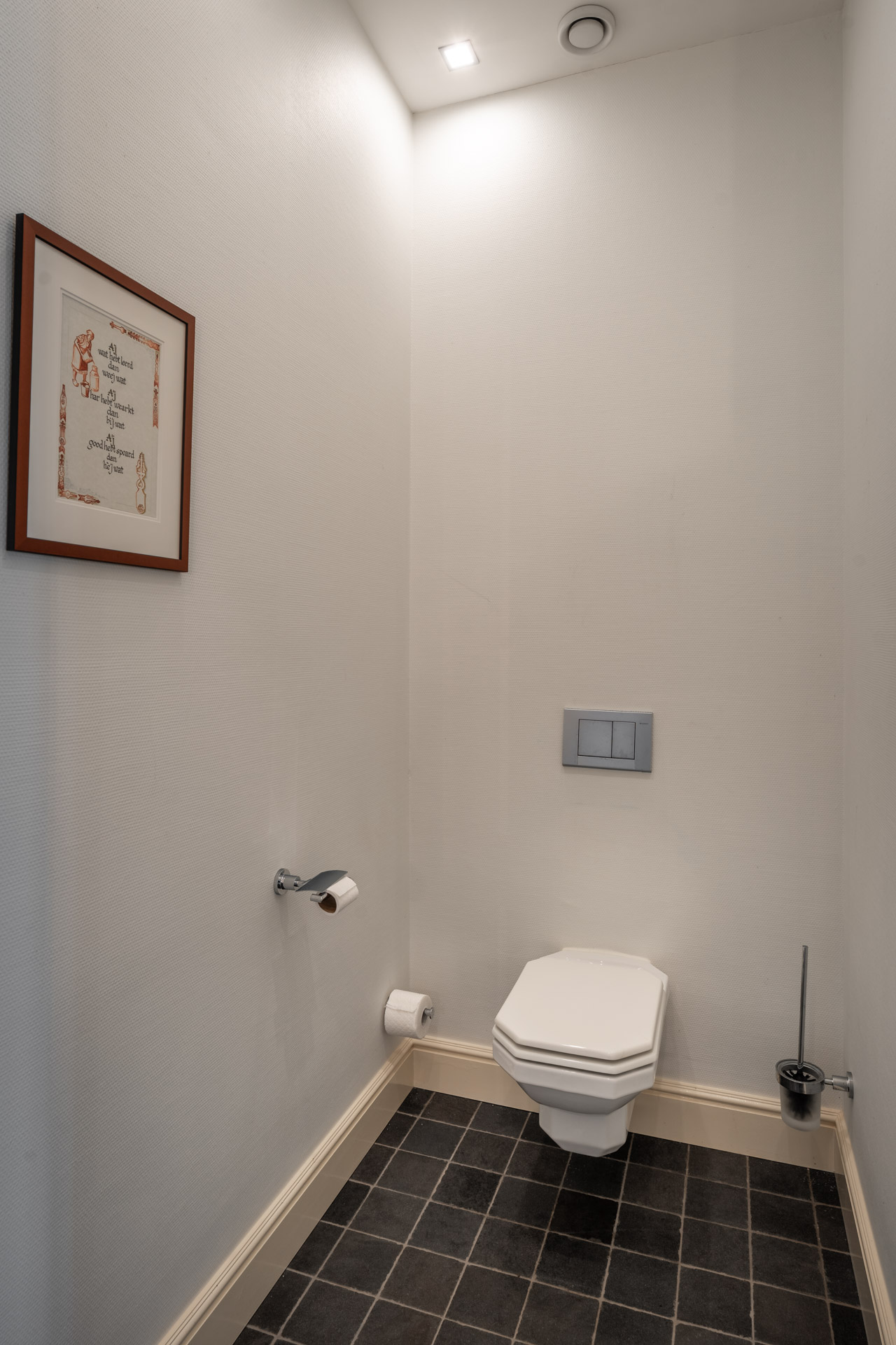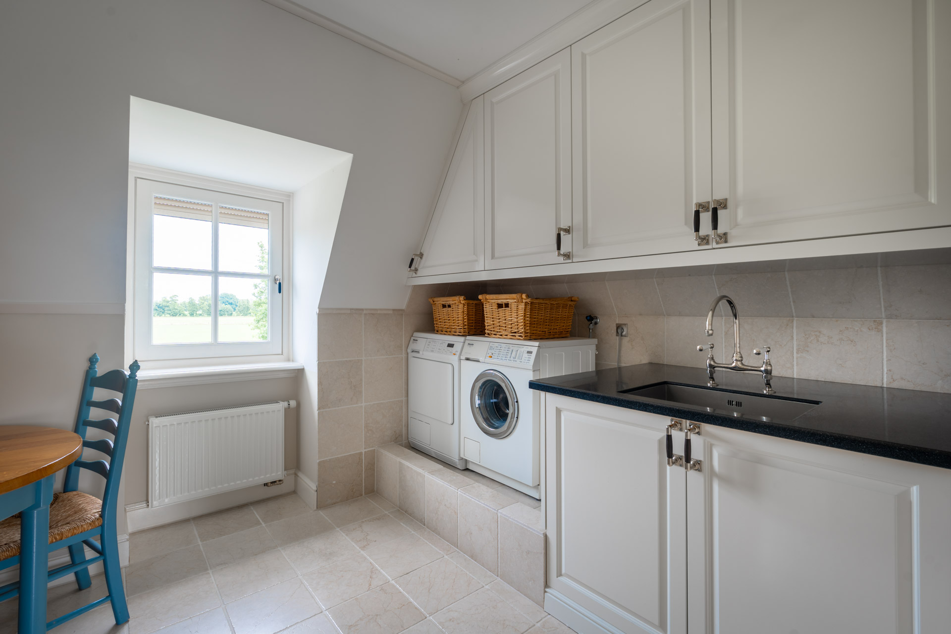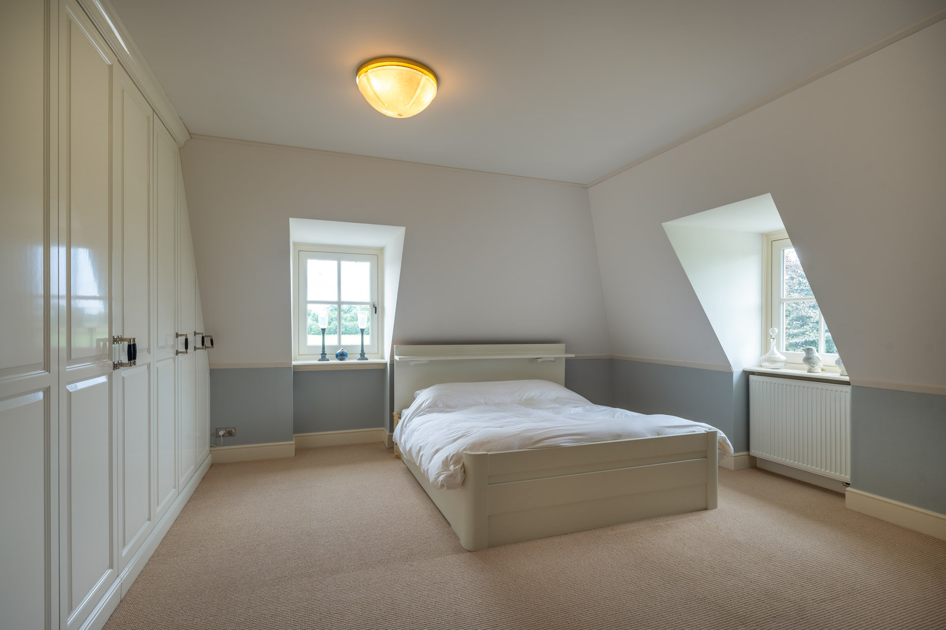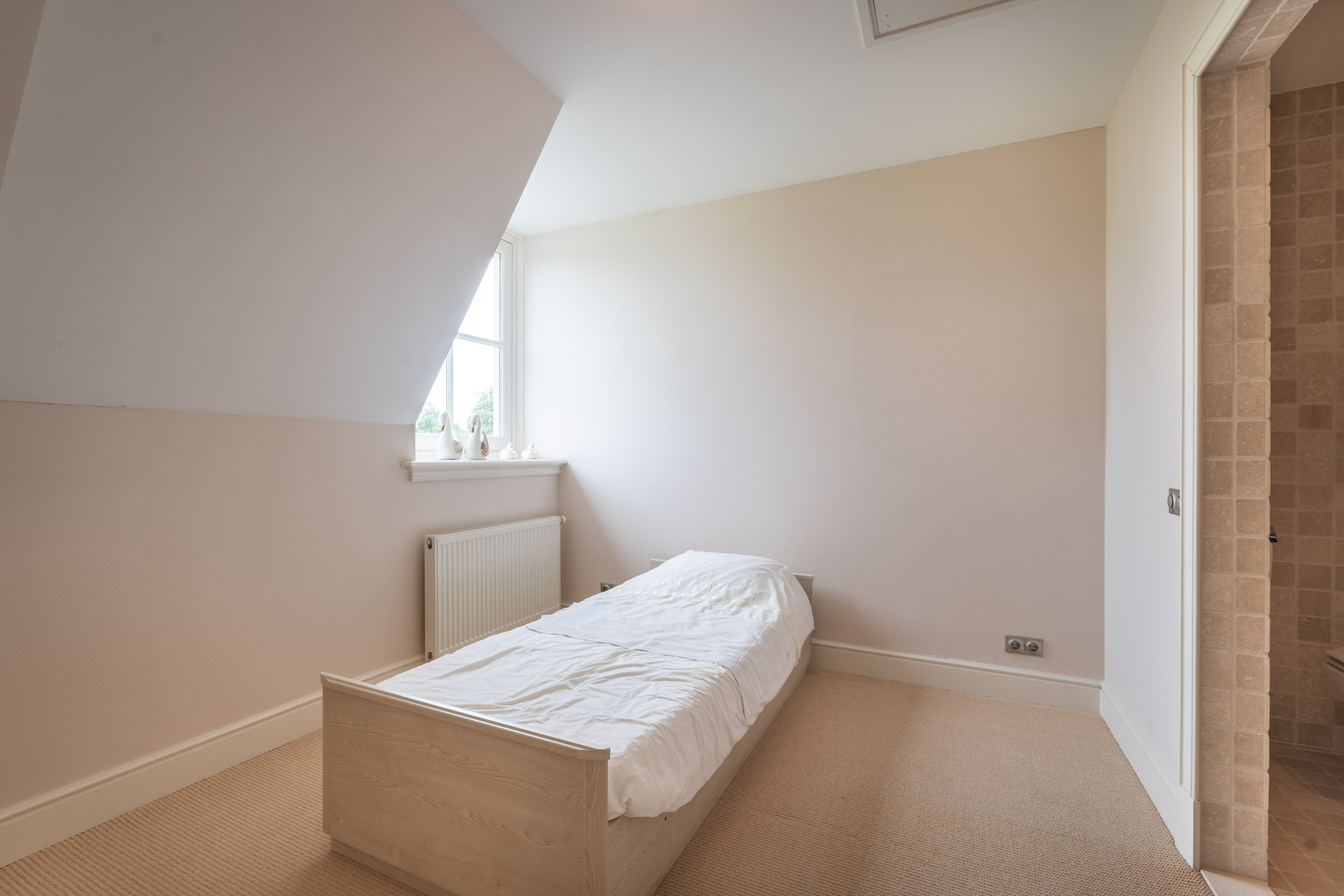 Aan de achterzijde van de verdieping bevindt zich een praktische berging, voorzien van keukenblok en witgoedaansluitingen, met aansluitend een derde slaapkamer. De verdieping weerspiegelt dezelfde rustige elegantie als de rest van het huis: doordacht, evenwichtig en met oog voor detail.