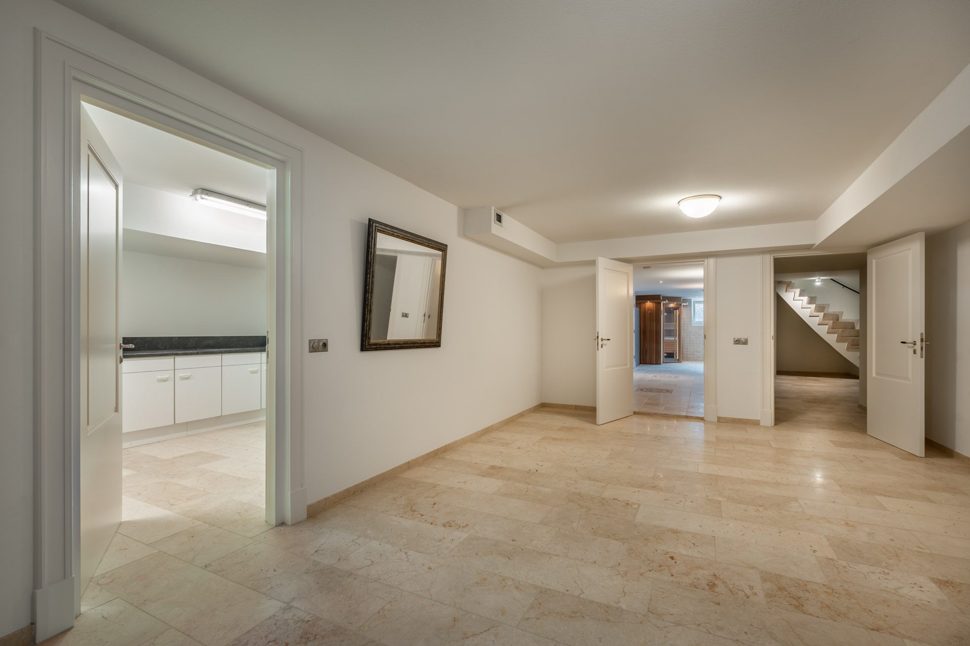 De kelderverdieping is daarnaast een luxe verlengstuk van het woonprogramma en biedt ruimte aan een complete privé wellnessafdeling met sauna, jacuzzi en bodycare-ruimte. Daarnaast zijn er meerdere bergingen en flexibel in te delen ruimten aanwezig – geschikt voor hobby, opslag of als wijnkelder.