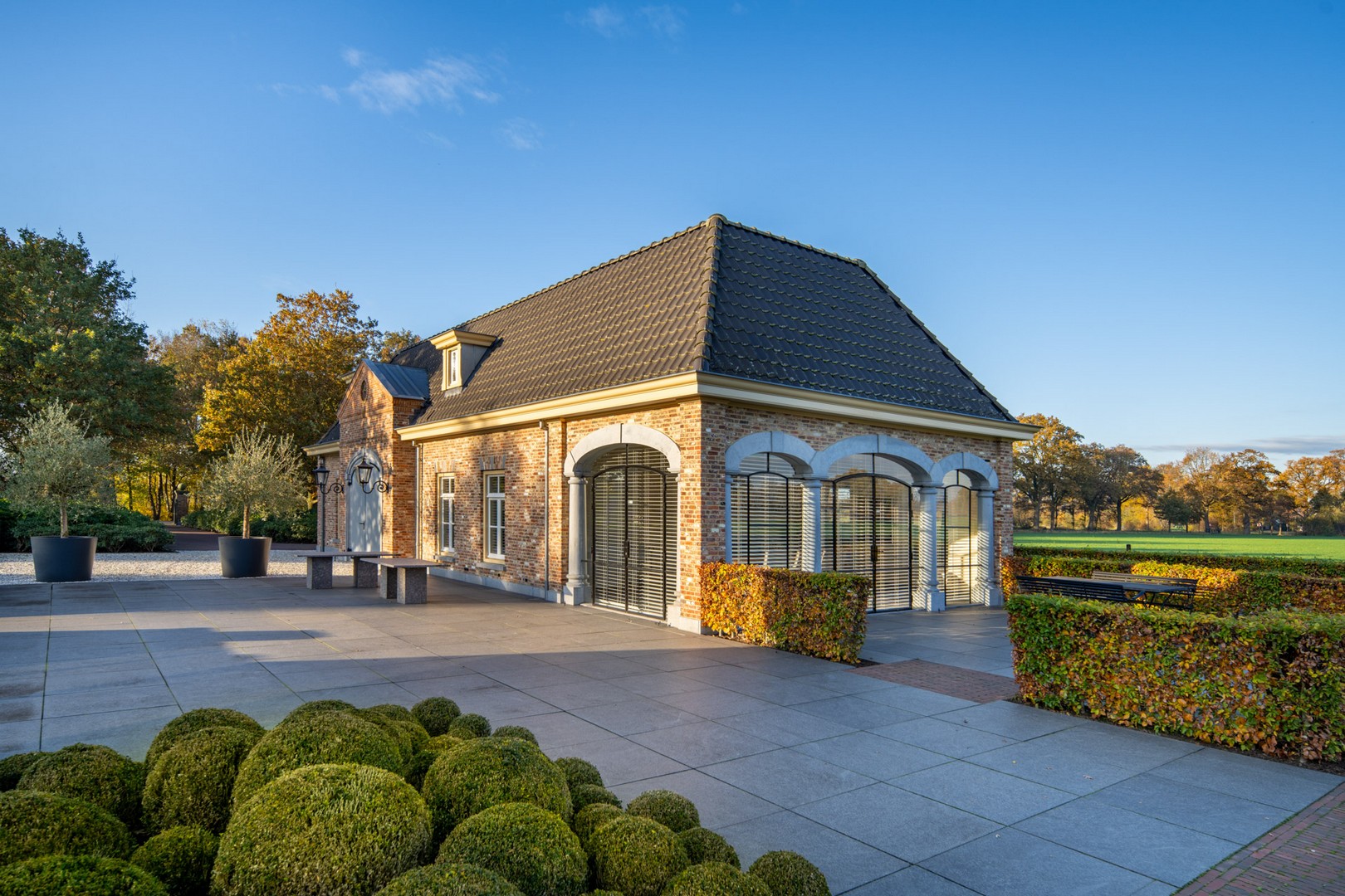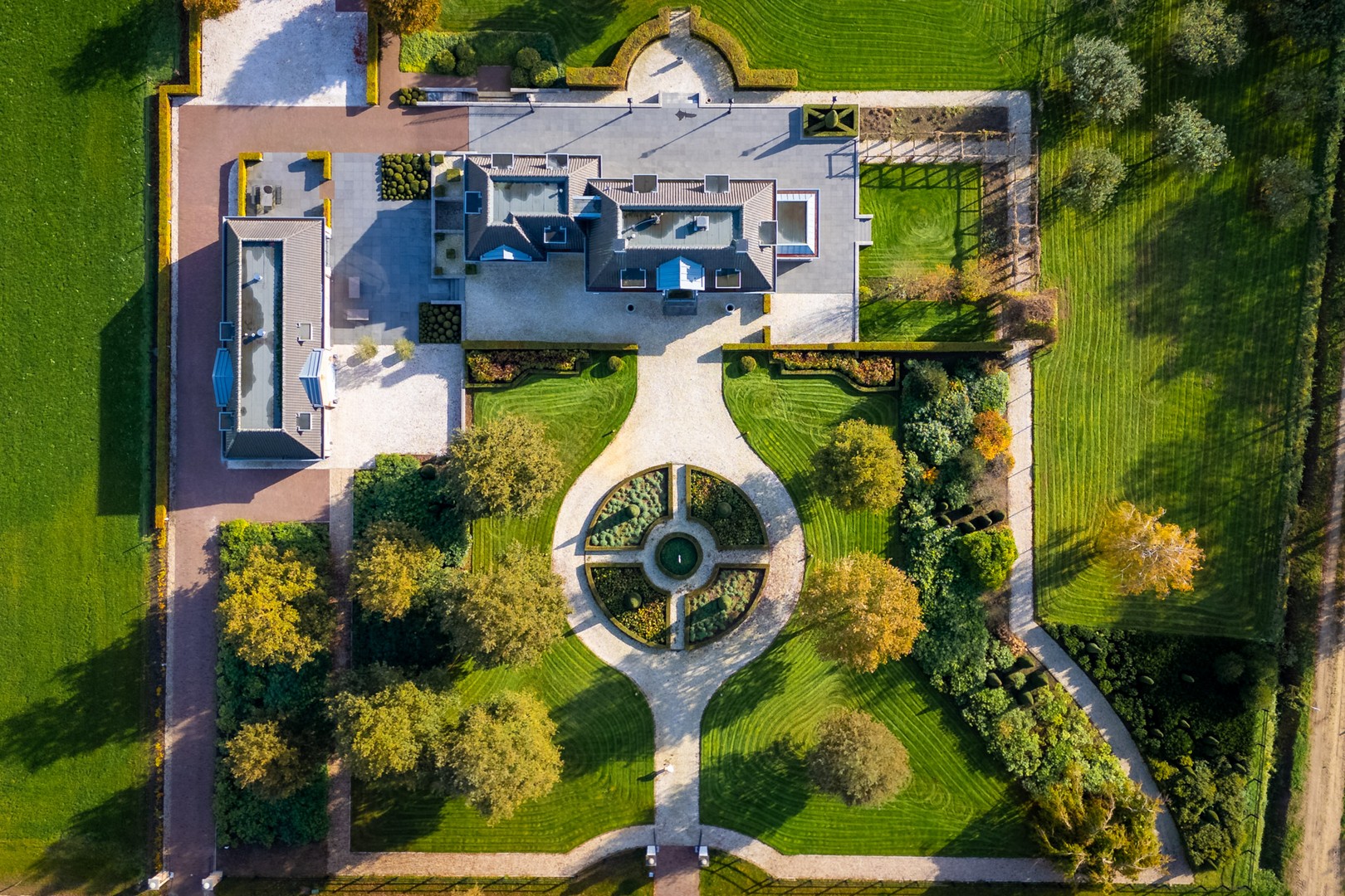 – Riante voortuin met strakke gazons, grindpaden, bomen, perken en hagen;
