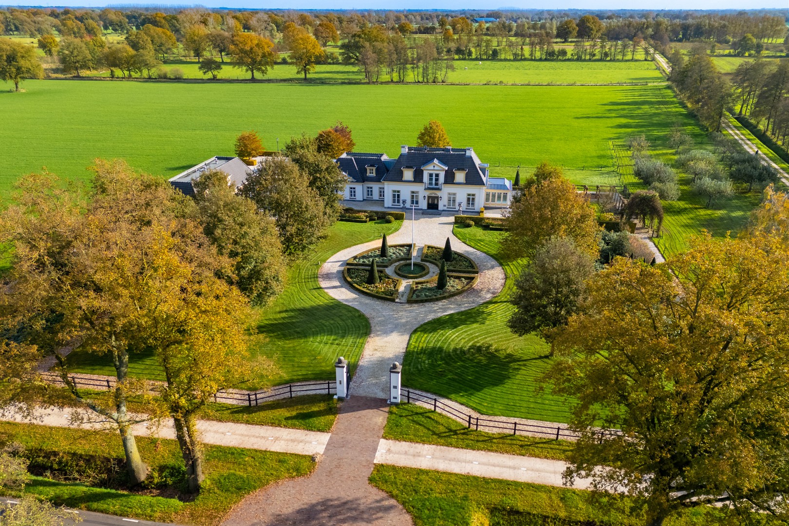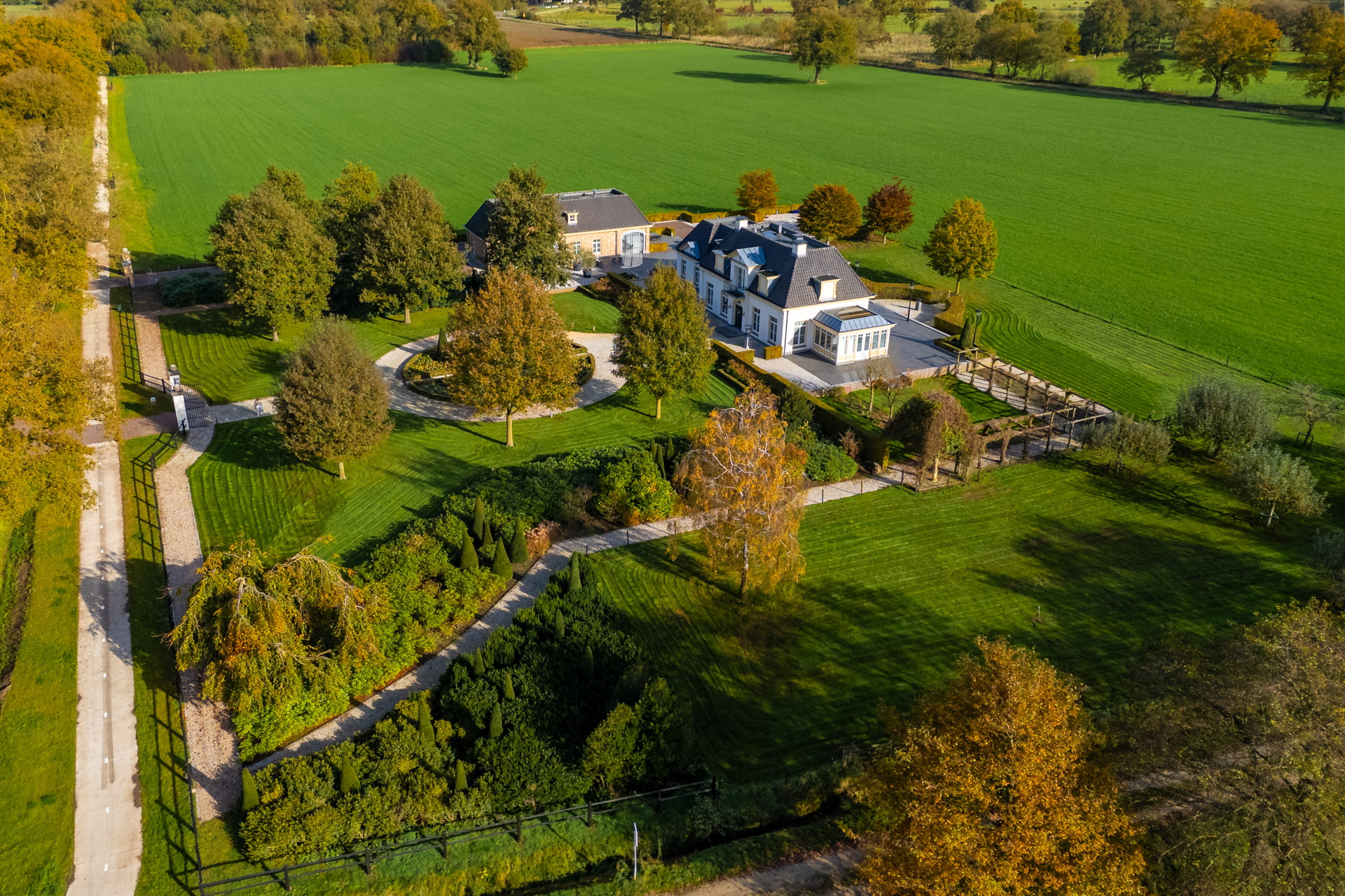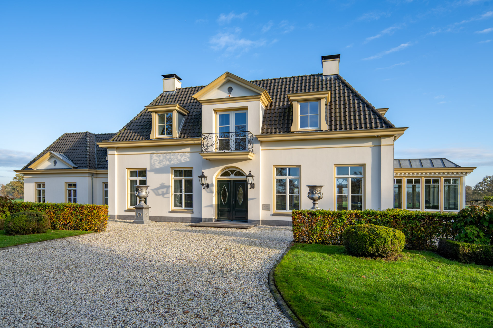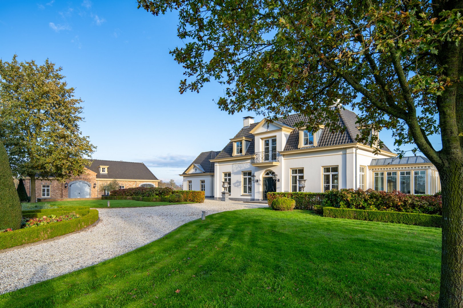 Een klassieke oprijlaan met grind leidt naar de woning, geflankeerd door strak geschoren hagen en volwassen loofbomen. De voortuin is vormgegeven met strakke gazons en zorgvuldig aangelegde bloemperken.