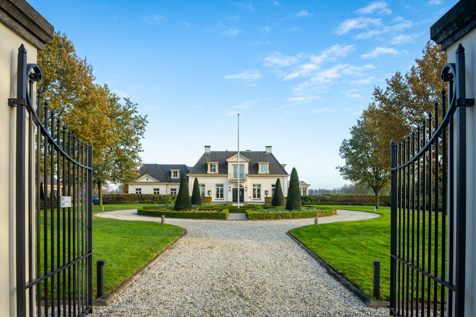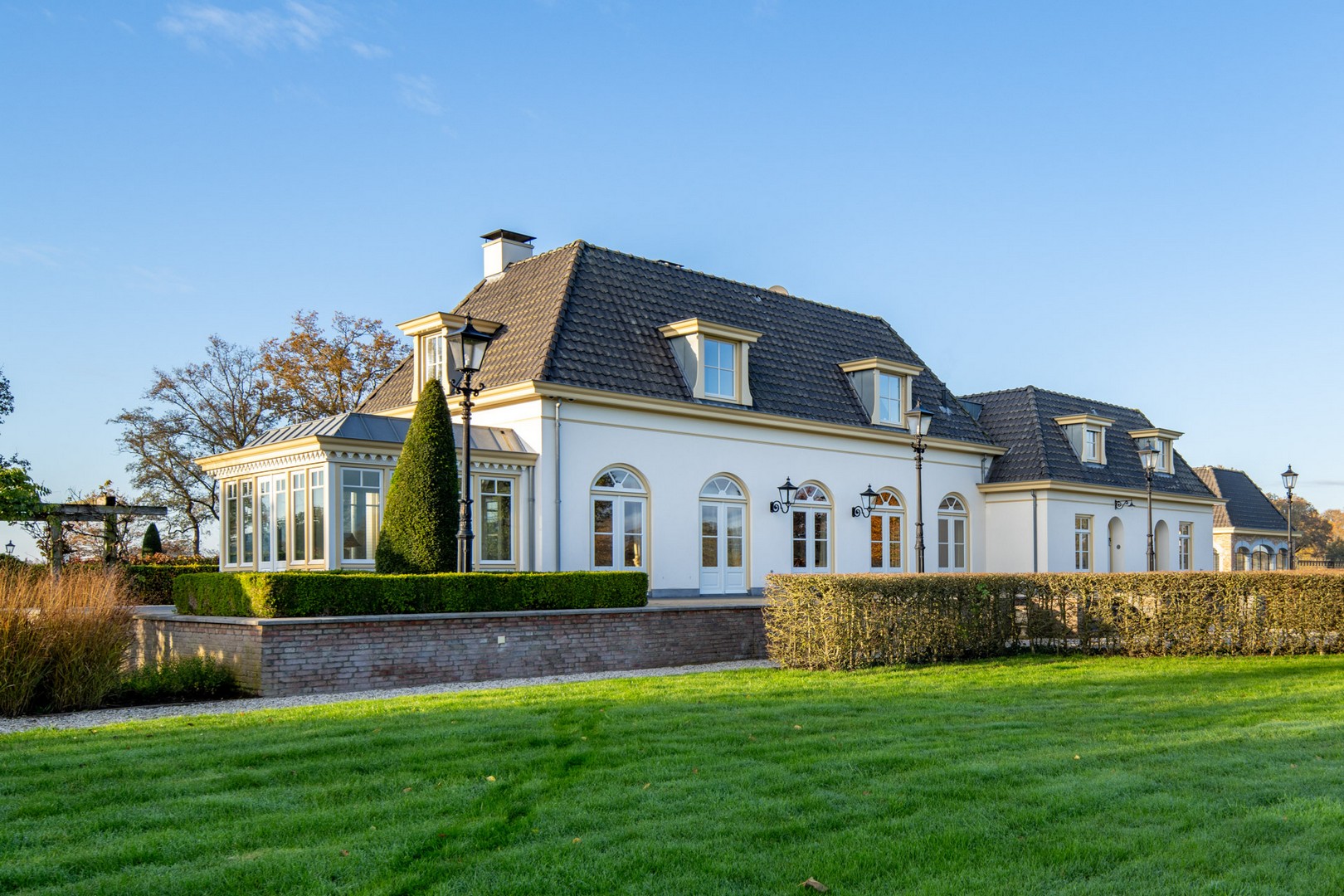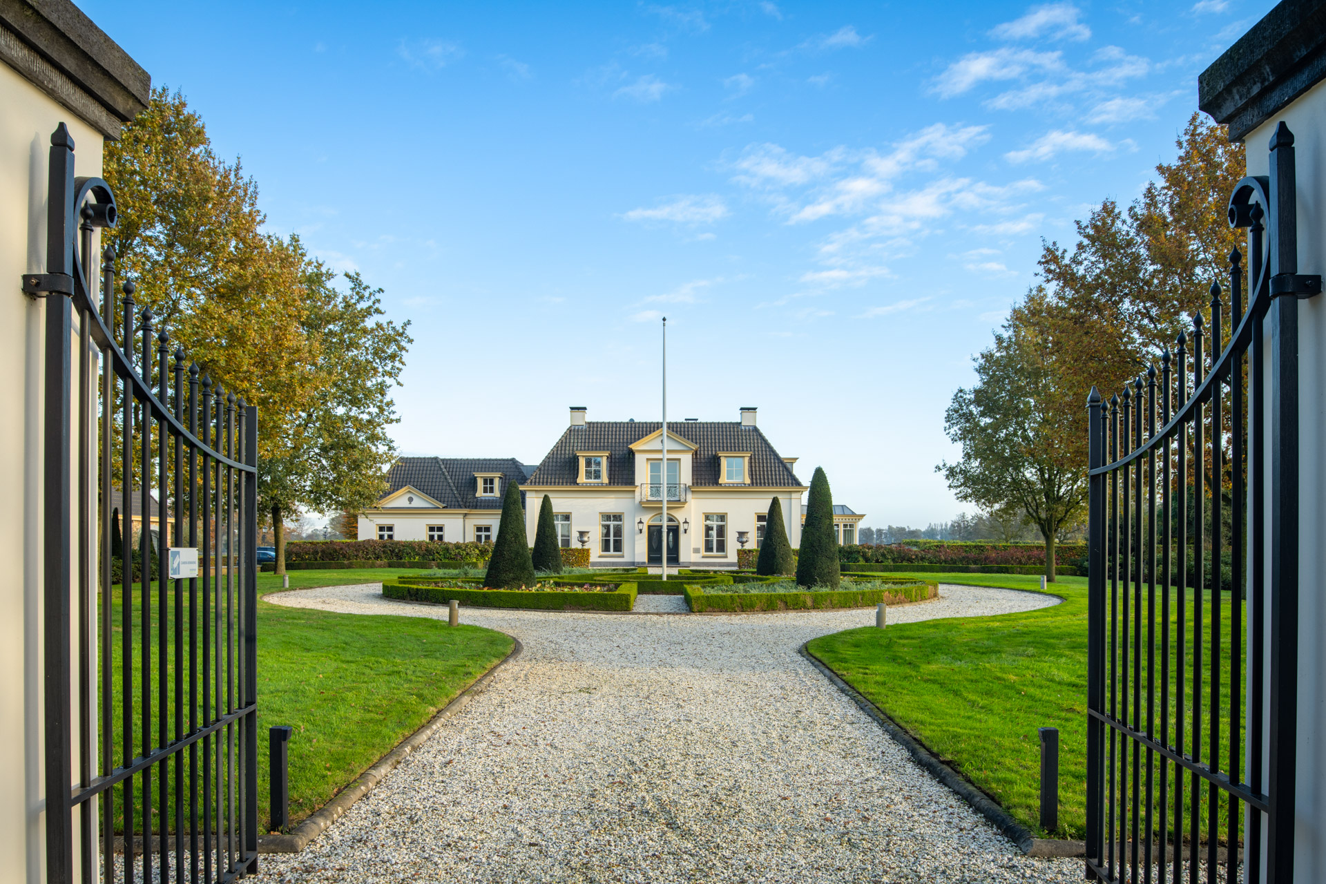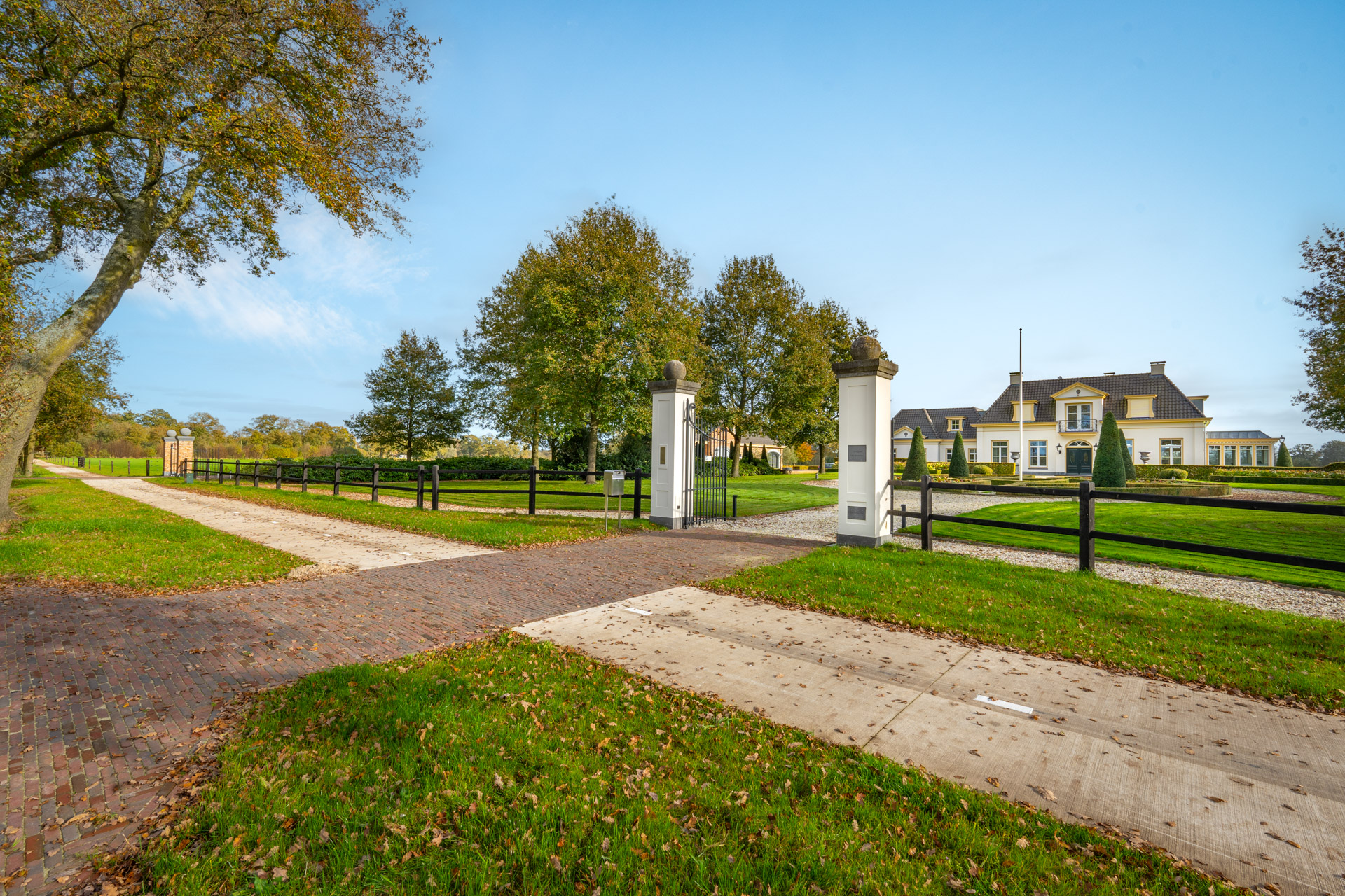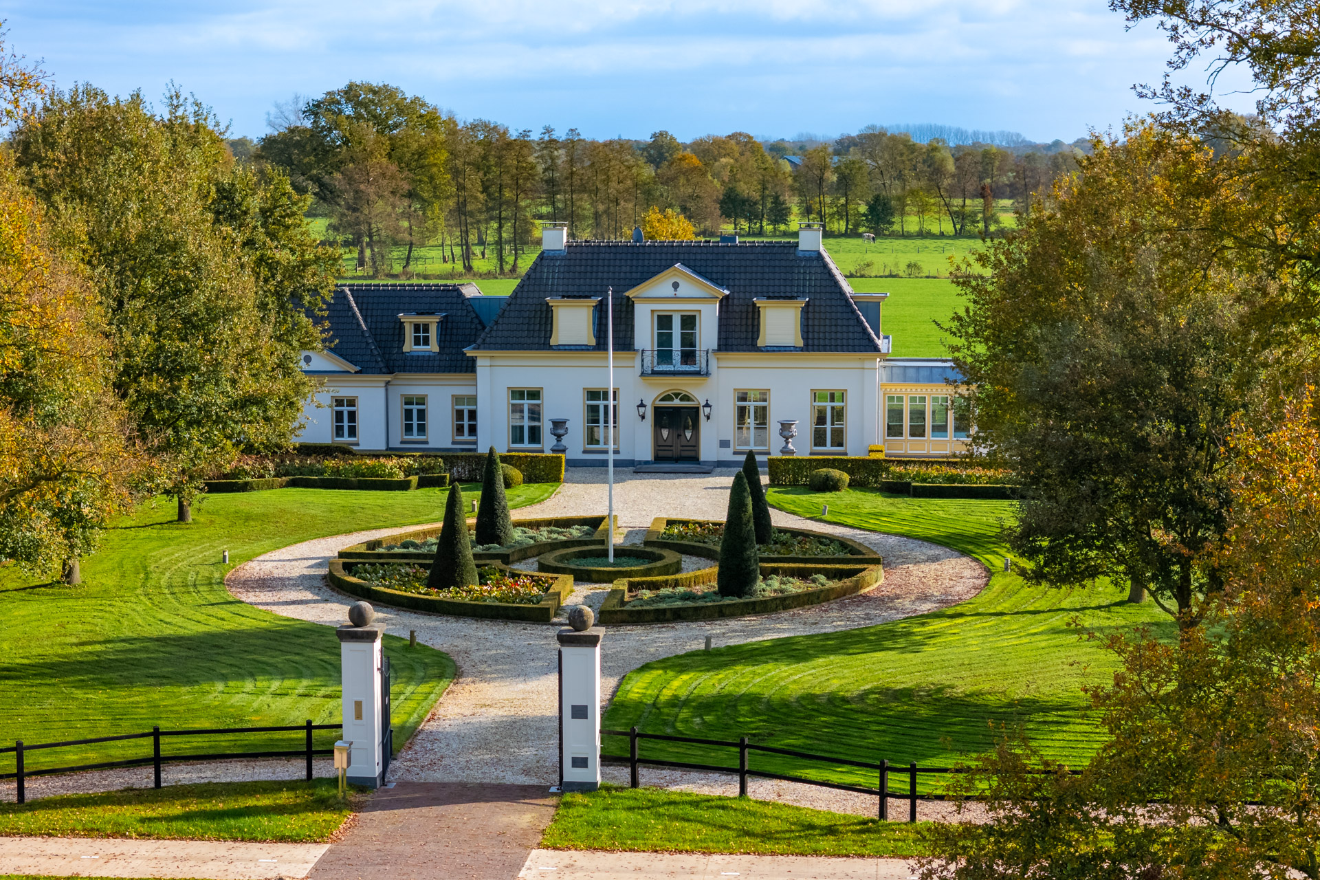 Een klassieke oprijlaan met grind leidt naar de woning, geflankeerd door strak geschoren hagen en volwassen loofbomen. De voortuin is vormgegeven met strakke gazons en zorgvuldig aangelegde bloemperken.