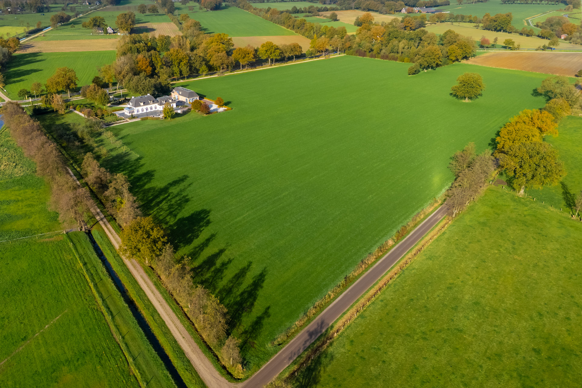 Verder weg van het huis gaan de formele lijnen over in het vrije Twentse landschap. Deze natuurlijke overgang geeft het landgoed zijn onderscheidende karakter.